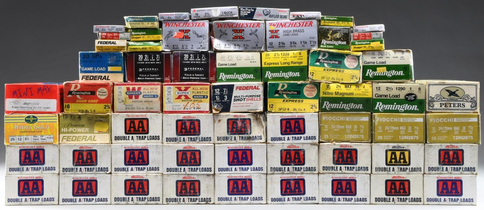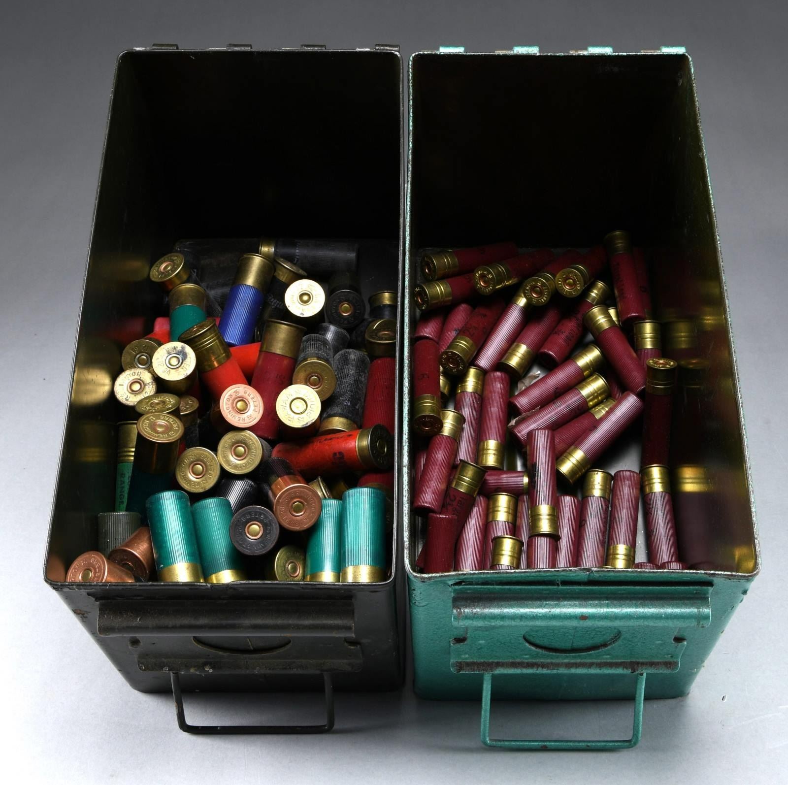 CONTAINS HOLLOW POINT AMMO. 12 GA., 2 3/4". : 5 RDS. (1 BOX) 00 BUCK. 10 RDS. (2 BOXES) hollow point rifled slugs. 75+ RDS. (3 BOXES) of #4. 50 RDS. (3 BOXES) of #6. 120+ RDS. (5 BOXES) of #7 1/2. 50 RDS. (2 BOXES) OF #8. 550 RDS. (22 BOXES) OF MIXED #7 1/2 & #8 ammo in Win. boxes. 50+ loose rds. in ammo can. 16 GA., 2 3/4": 50 RDS. (3 BOXES) #6. 45+ RDS. (2 BOXES) #8. 5 RDS. (1 BOX) Rem. Slugger hollow point rifled slugs. 5 RDS. (1 BOX) Win. 1 Buck. 20 GA., 2 3/4": 5 RDS. (1 BOX) 3 BUCK. 43 RDS. (2 BOXES) Rem. #6. 75 RDS. (3 BOXES) Federal #7 1/2. 28 GA., 2 3/4": 49 Rds. loose in ammo can. 410, 2 1/2": 15 RDS. (3 BOXES) of Win. rifled hollow point slugs. 410, 3": 5 RDS. (1 BOX) Win. OOO Buck. 10 RDS. (2 BOXES) Rottweil Brenneke slugs. 4 RDS. (1 BOX) Rem. #5. CONDITION: boxes in fair to very good condition; ammo appears serviceable. (02-16944-4/MD). $300-400.