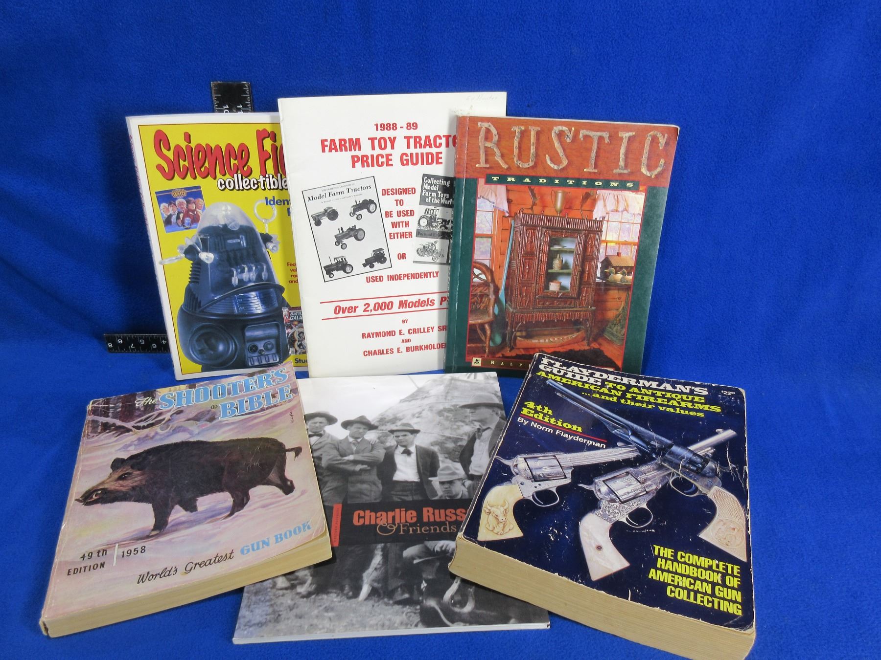 6 Books - Science Fiction Collectibles, Farm Toy Tractor Price Guide 1988-89, Rustic Traditions, Charlie Russell & Friends, The Shooter's Bible 1958, Flayderman's Guide to Antique American Firearms