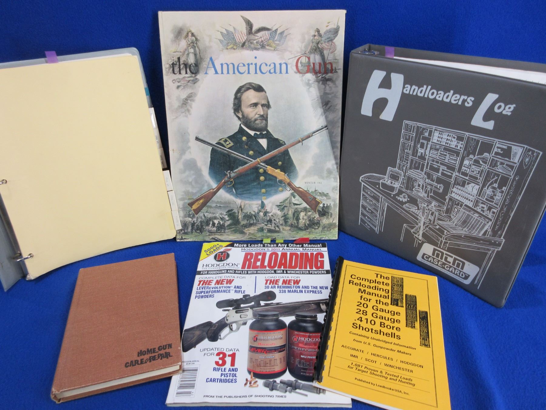 6 Books - MTM Handloaders Log, R.S.L. Sports Equipment, Home Gun Care and Repair, Complete Reloading Manual, Hodgdon Reloading, The American Gun