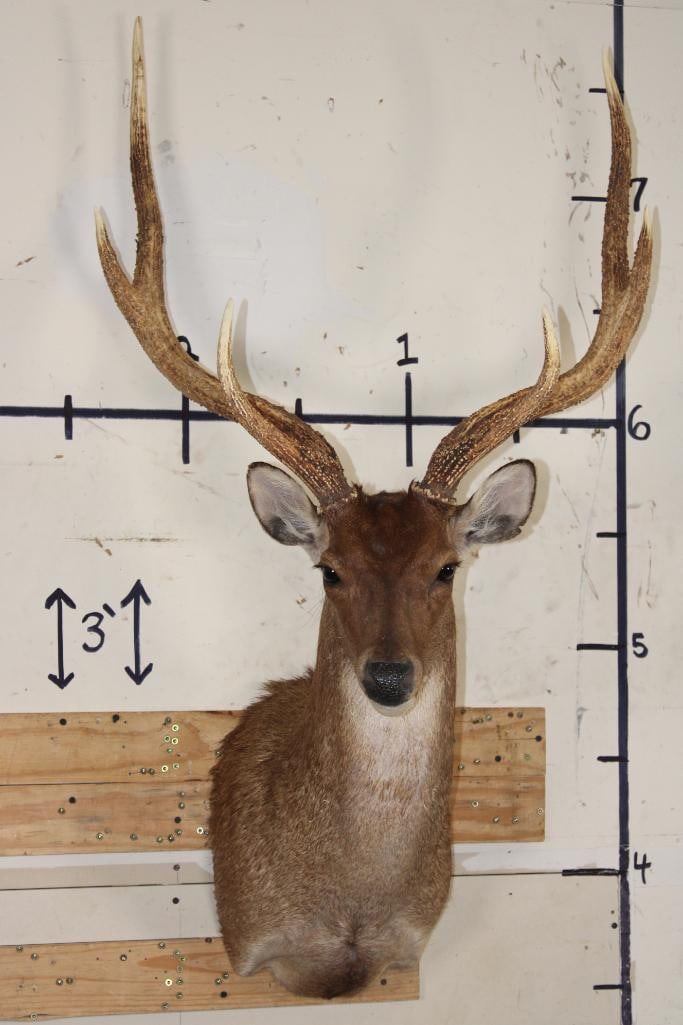 Very Nice, Clean, and Newer 6-Point RUSA DEER Shoulder Mount. It has a 26.5" Spread and is in Very Good Condition. TAXIDERMY