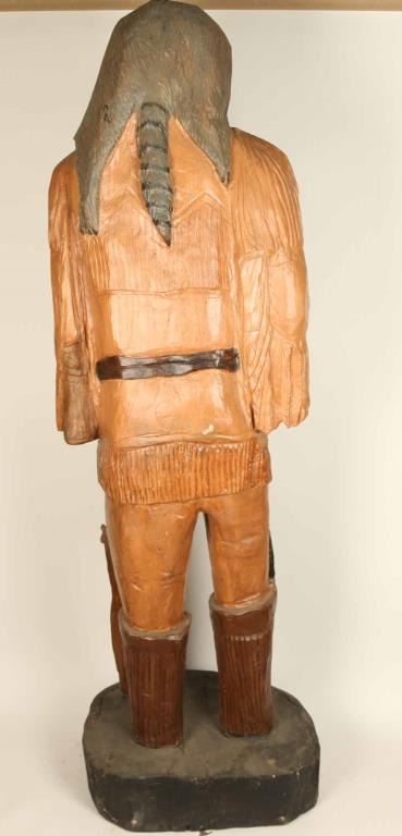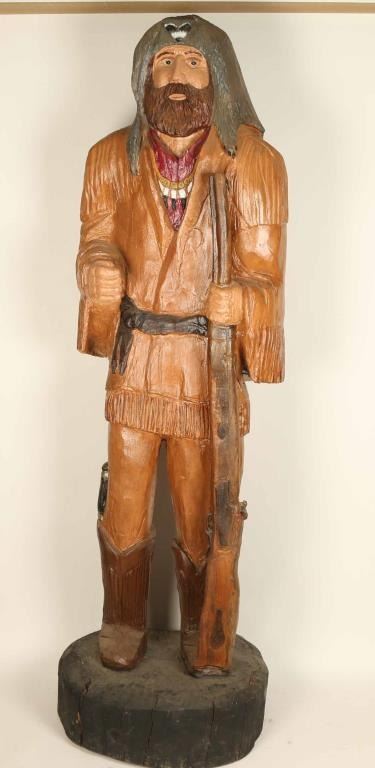This wonderfully carved wooden mountain man sports a raccoon cap and has a firm grip on a wooden rifle. This carving measures 21" x 20" x 72". Piece is signed "M. Critzer" on base.