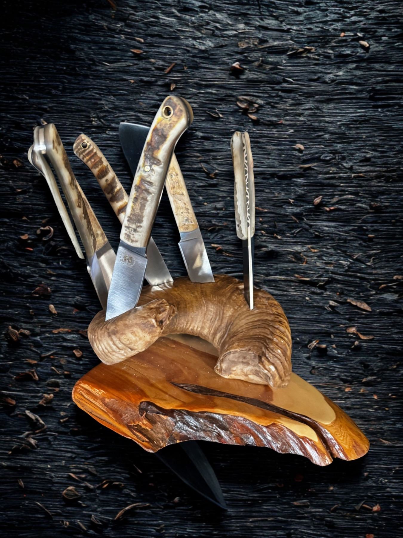Description: 6 piece Sheep Horn Steak Knife Set with Custom 3d printed Sheep Horn and Juniper Stand.