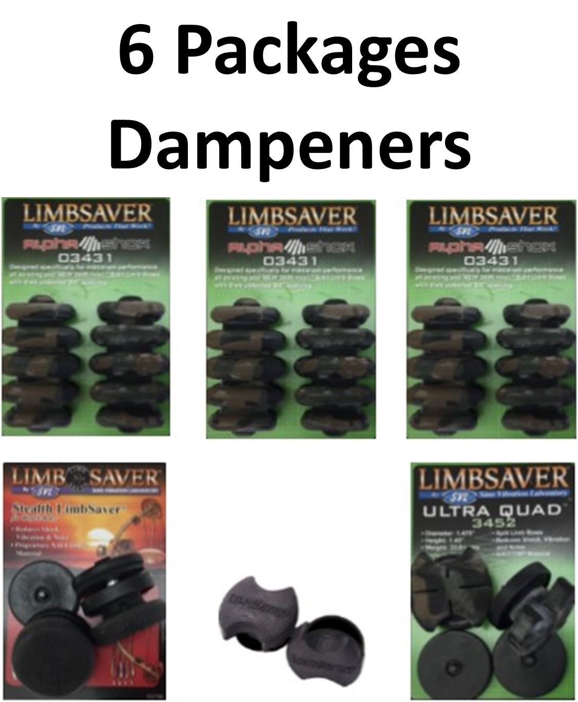 6 x Limb Dampeners, 3-AlphaShox Camo, 1-Stealth Hoyt Split, 1-Stealth Hoyt Ultra Split,1-2007 Split Camo