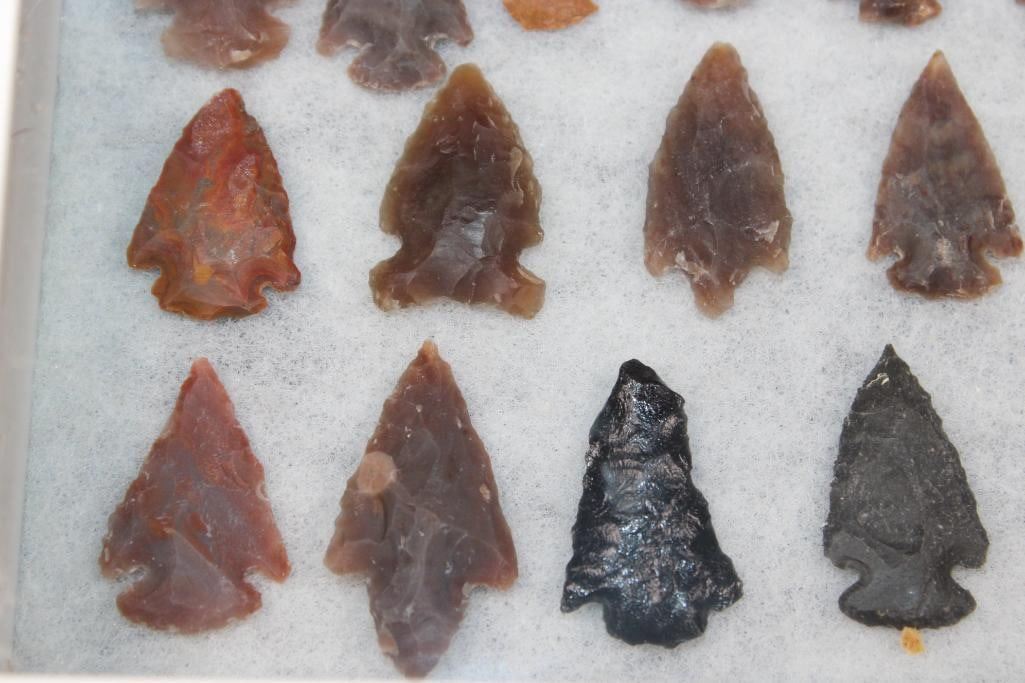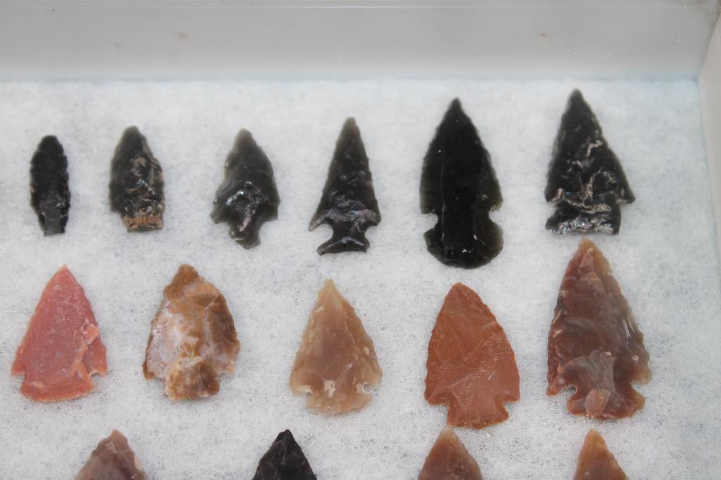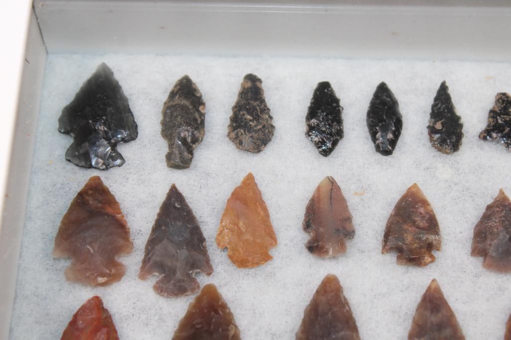 60 Native American PROJECTILE POINTS or ARROWHEADS in a Glass Display Case. The Collection includes various styles, such as corner-notched points, which often date back to the Early Archaic period. The Arrowheads showcase different natural stone colors and textures, ranging from dark obsidian to lighter chert or jasper. They Arrowheads measure 1/2" Long to 2.25" Long each. The Display Case with Glass measures 15 1/8" Long x 7 1/8" Wide x 1.25" Thick. NATIVE AMERICAN ARTIFACTS?