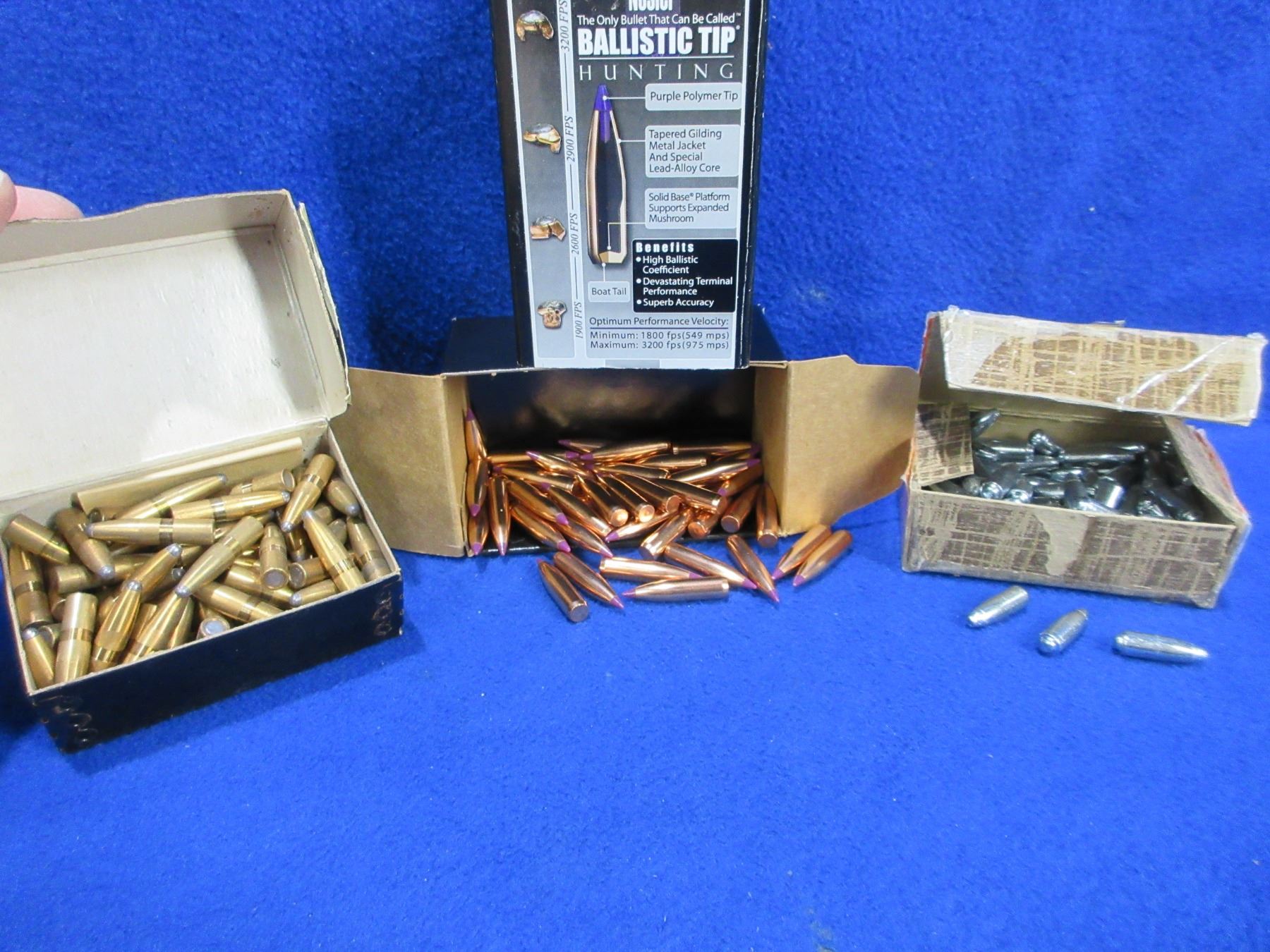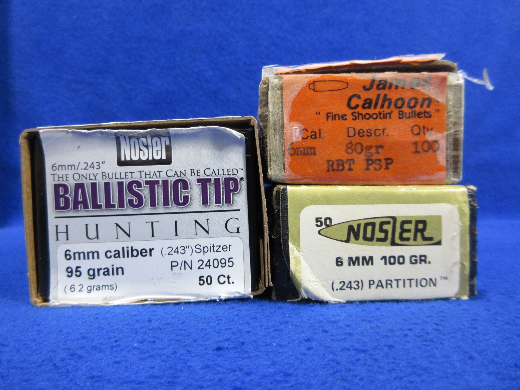 6MM .243" Nosler and James Calhoon Bullets - Box of 50 (Nosler 95gr Spitzer), Box of 73 (Nosler 100gr Partition), Box of 81 (Calhoon 80gr RBT PSP)
