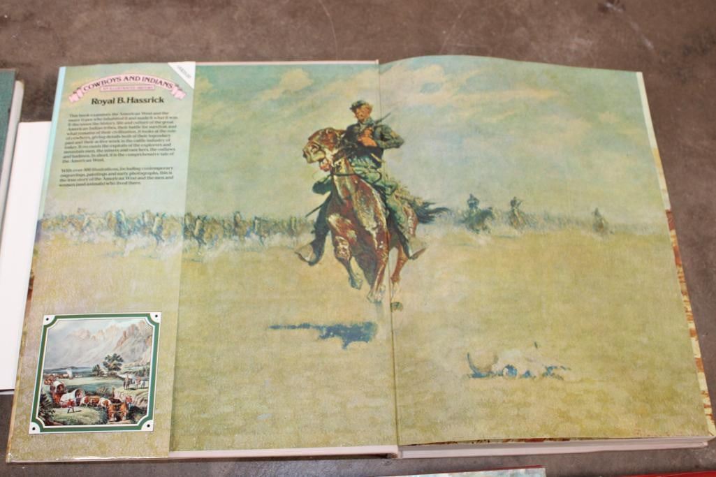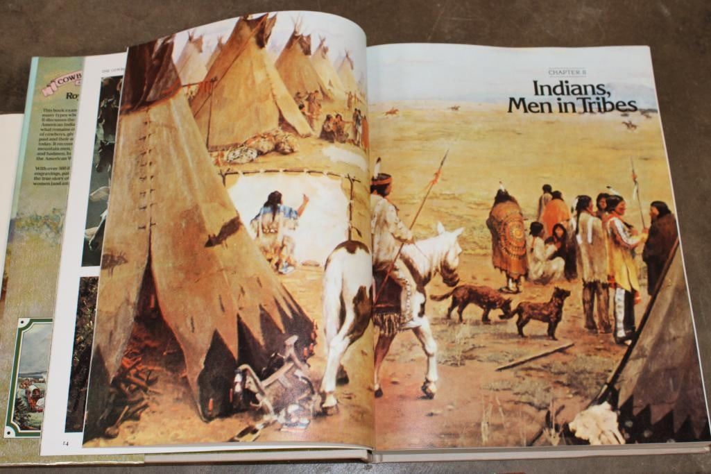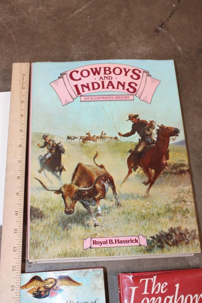7 BOOKS on the Old West, Cowboys, and Indians. "Being a New and Original Exploration, in Art and Words, Into the Life and Times of the American Cowboy" Numbered #10,750/50,000 and Signed by the Author "Caleb Pirtle". "Cowyboy Life on the Texas Plains" 1982, it has been signed by the Editor Margaret Rector and the introduction author John Graves. "Cowboys and Indians, an Illustrated History" by Royal B. Hassrick 1976. "The American Heritage Book of Indians" by the Editors of American Heritage 1961. "Tom Ryan a painter in Four Sixes Country" by Dean Krakel 1971. "The American Heritage History of the Great West" by American Heritage Publishing. "The Longhorns" by J. Frank Dobie. (ONE$) COLLECTIBLE NATIVE AMERICAN AND WESTERN HISTORY BOOKS