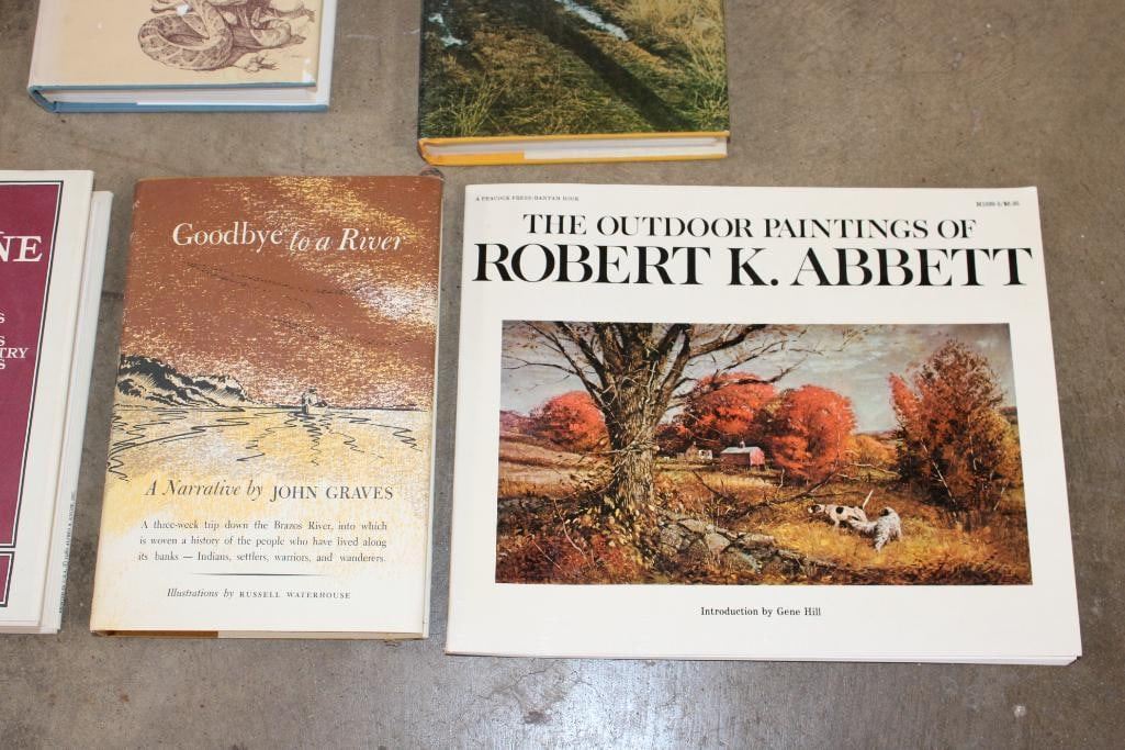 7 Books. 1981 "Blue and Some Other Dogs" signed by the Author John Graves. 1959 "Goodbye to a River" by John Graves. 1980 "From A Limestone Ledge" by John Graves. 1973 "Hard Scrabble" by John Graves. 1965 "The Wire That Fenced The West" by Henry D. and Frances T. McCallum. 1965 "Rattlesnakes" by J. Frank Dobie. 1976 "The Outdoor Paintings of Robert K. Abbett" Introduction by Gene Hill. (ONE$) COLLECTIBLE BOOKS