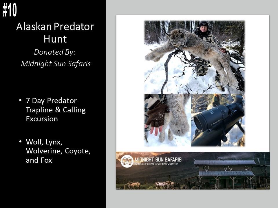 Most hunts, unless otherwise noted, are for the upcoming season. All trips, unless otherwise noted, expire January 31, 2018. Special arrangements other than as set forth on the auction list are expressly between the donor and yourself.