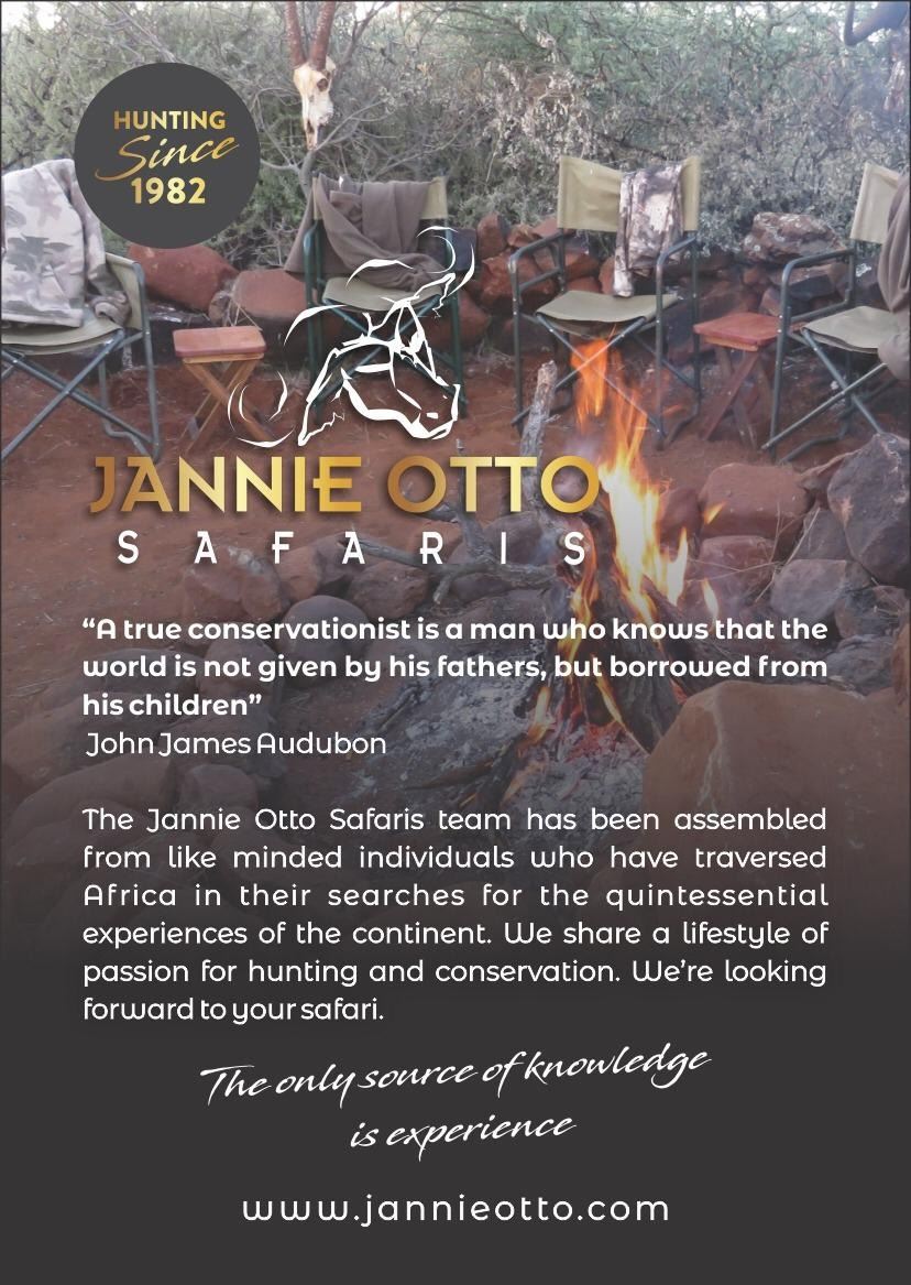Donated by Jannie Otto Safaris. Method of take is hunters’ choice. Schedule hunt with Outfitter for open dates in March-November 2022/2023. Allow extra traveling days between provinces. When you hunt with Jannie Otto Safaris you get more than 36 years of African Big Game Hunting experience. Jannie is a past Wildlife Manager for the South African Nature Conservation. Jannie knows the areas and the animals, conducting hunts in South Africa, Mozambique and Tanzania.