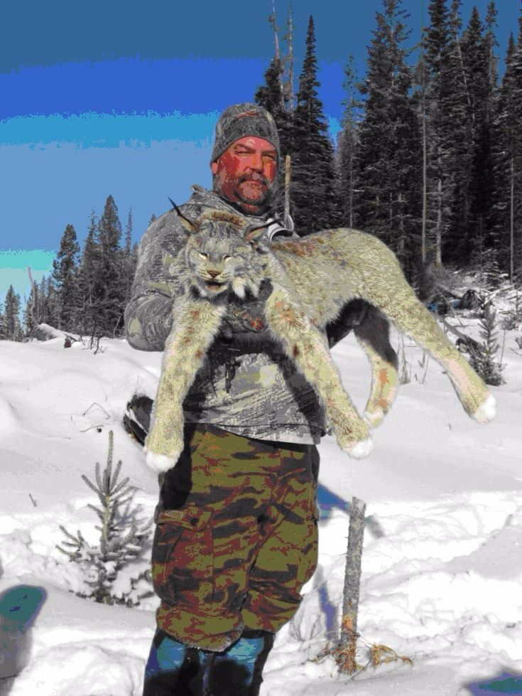 Special Notes: Lynx are plentiful in our area and we can usually find a track fresh enough to chase every day. Four wheel drive trucks and snowmobiles are used for transportation when looking for a fresh track. When a fresh track is found, specially trained hunting dogs are used to track and tree the Lynx. Once the Lynx is treed, we then walk to the tree. It may be a short walk of 15 minutes or a hike of a few hours. We try to get as close as possible to the tree using the truck and snowmobiles. The caliber of rifle recommended for Lynx is a 22, but any small caliber will do as long as it won’t tear up the hide. We are now up to 90% success on these hunts.