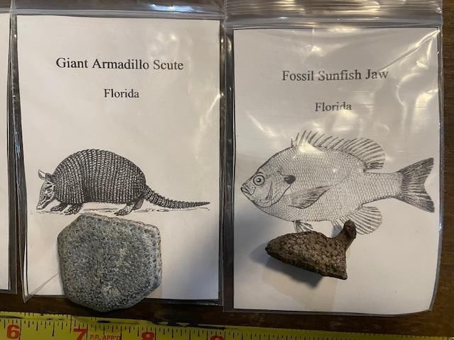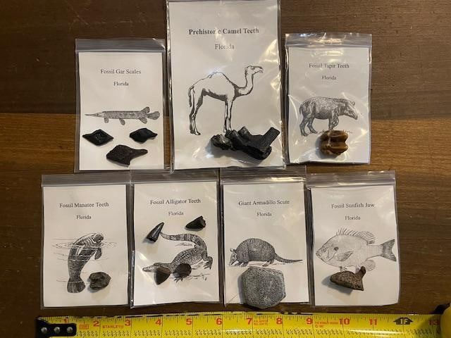 7 Different Prehistoric Fossilized Artifacts. 7 Different Prehistoric Fossilized Artifacts. There are Alligator Teeth Fossils, a Tapir Tooth Fossil, a Manatee Tooth Fossil, Camel Tooth Fossil, a Giant Armadillo Scute, Fossil Gar Scales and a Fossilized Sunfish Jaw. These are all excellent scientific specimens and educational oddities. ANIMAL TOOTH FOSSILS and ARTIFACTS
