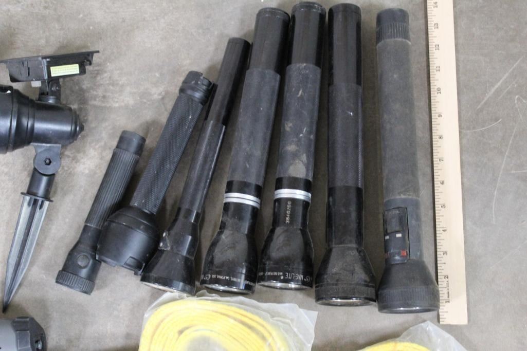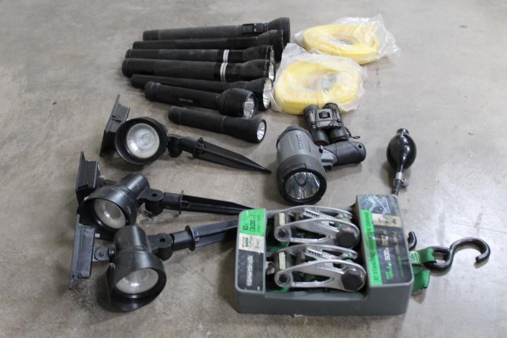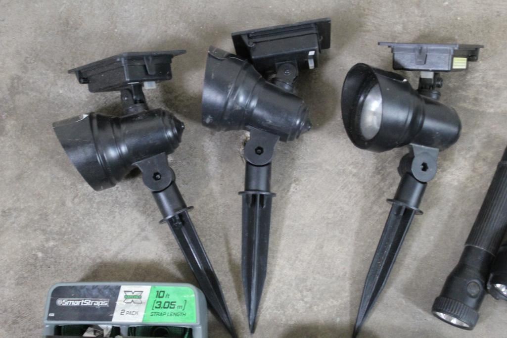 Big Miscellaneous Lot! 7 Flashlights, 3 Solar Lights, Hatchet Straps, a Spotlight, a Hand Air Pump with a needle, and 2 yellow braided straps. None have been tested. HUNTING AND CAMPING FLASHLIGHTS AND EQUIPMENT