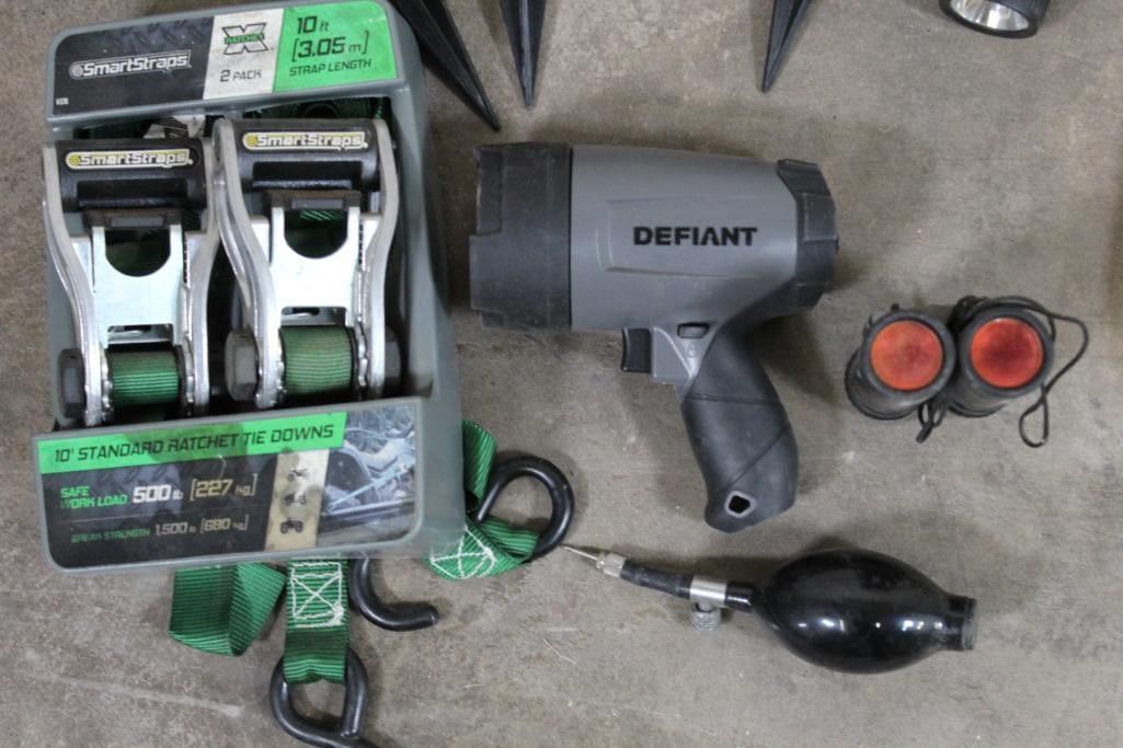 (7) Flashlights, (3) Solar Lights, Hatchet Straps, Spotlight, and Hand air pump (ONE$)