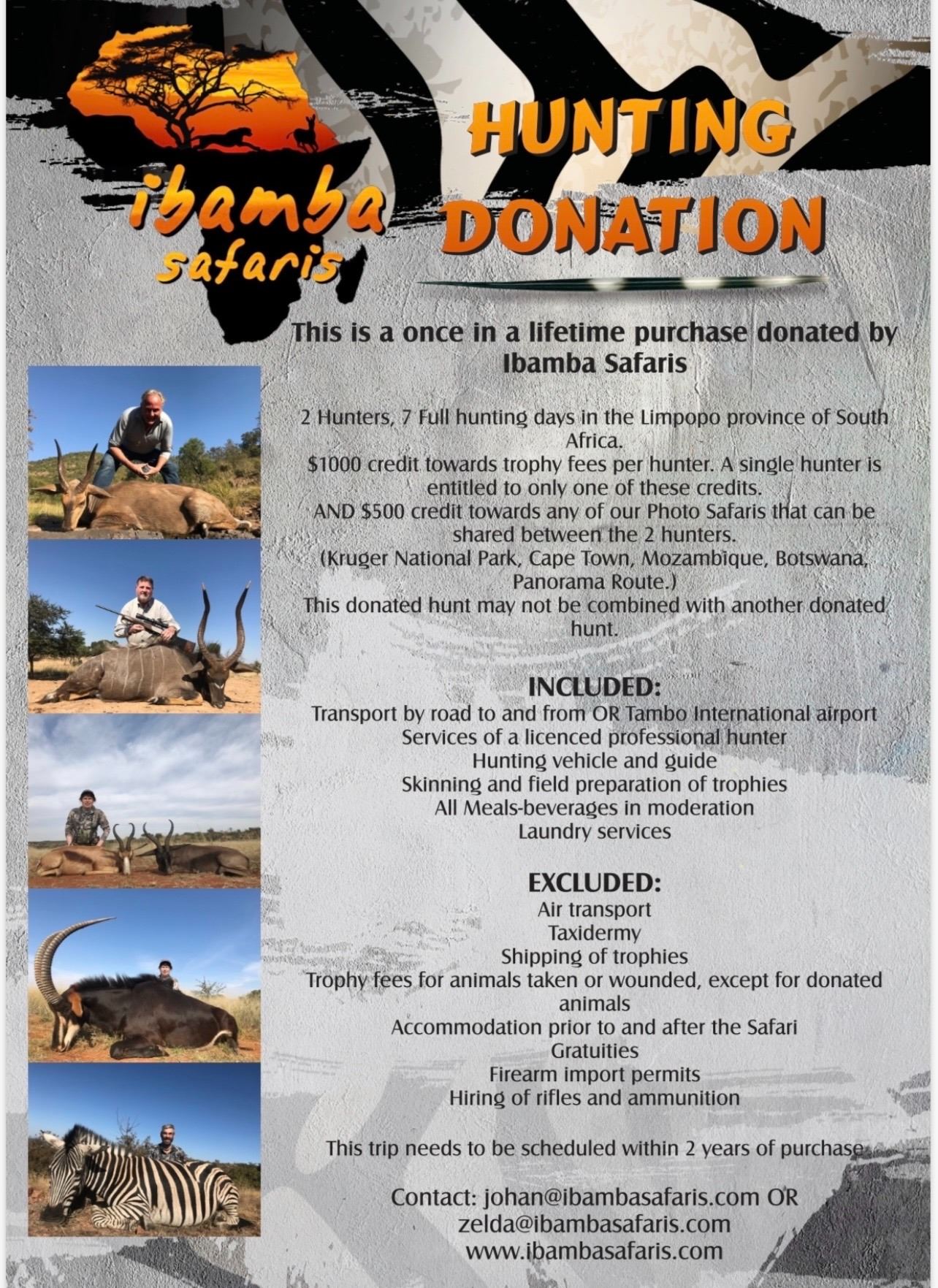 #28. 7 HUNTING DAYS FOR 2 HUNTERS WITH $2,000 CREDIT: hunt in the Limpopo province of South Africa with Ibamba safaris. Included: 2 hunters for 7 full hunting days, $1,000 credit for trophy fees per hunter, $500 credit towards photo safaris that shared between the hunters (Kruger, Cape Town, Mozambique, Botswana & Panorama Route. Transport by road to and from OR Tambo International Airport, services of a licensed professional hunter, hunting vehicle, skinning and field preparation of trophies, all meals – beverages in moderation, and laundry services.