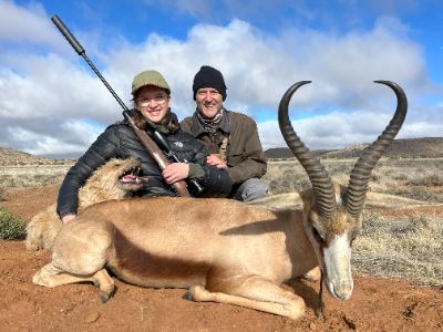 Jules of the Karoo invites one hunter and one non-hunter for a unique 7-day, 2x1 guided four-species springbok hunt in South Africa.