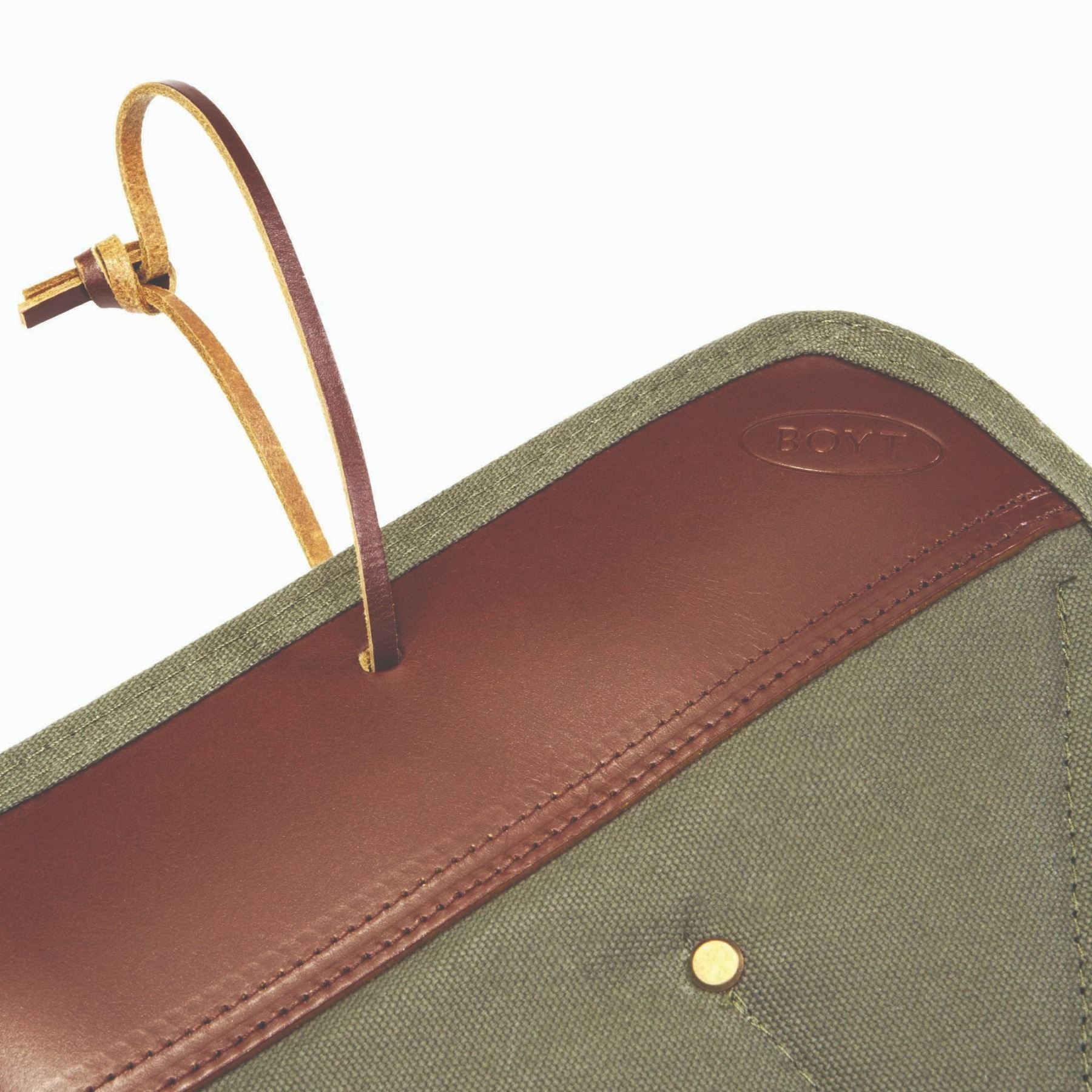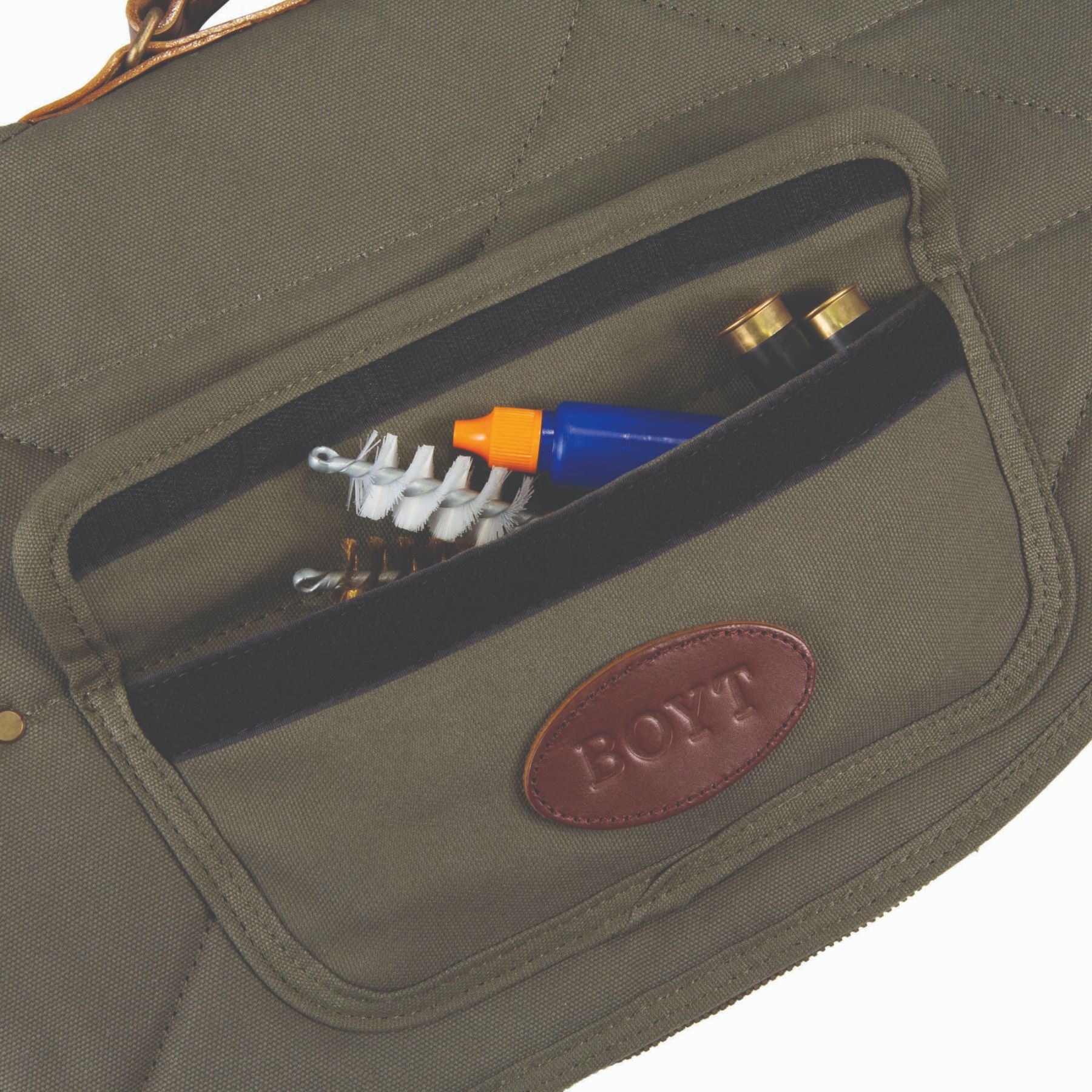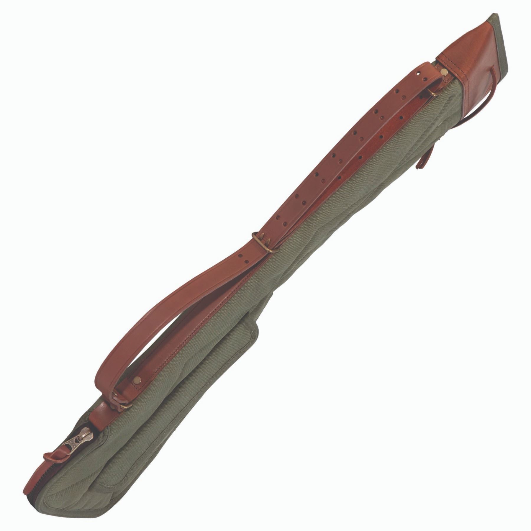 •Waxed canvas shell on this 50” shotgun case in olive drab
