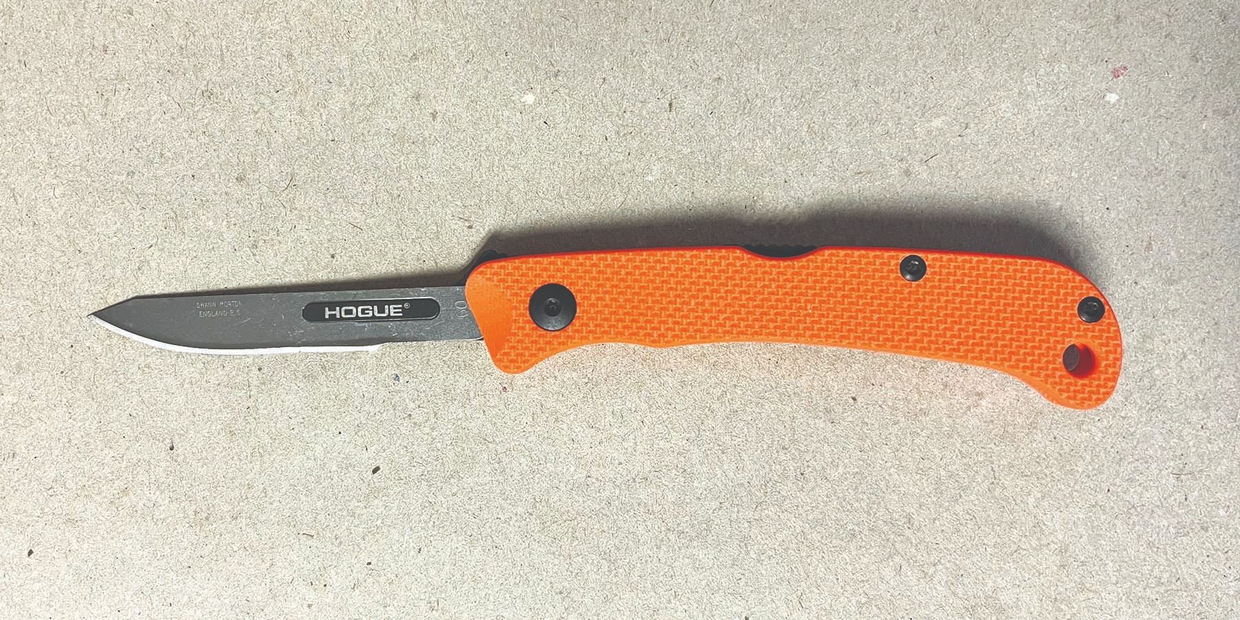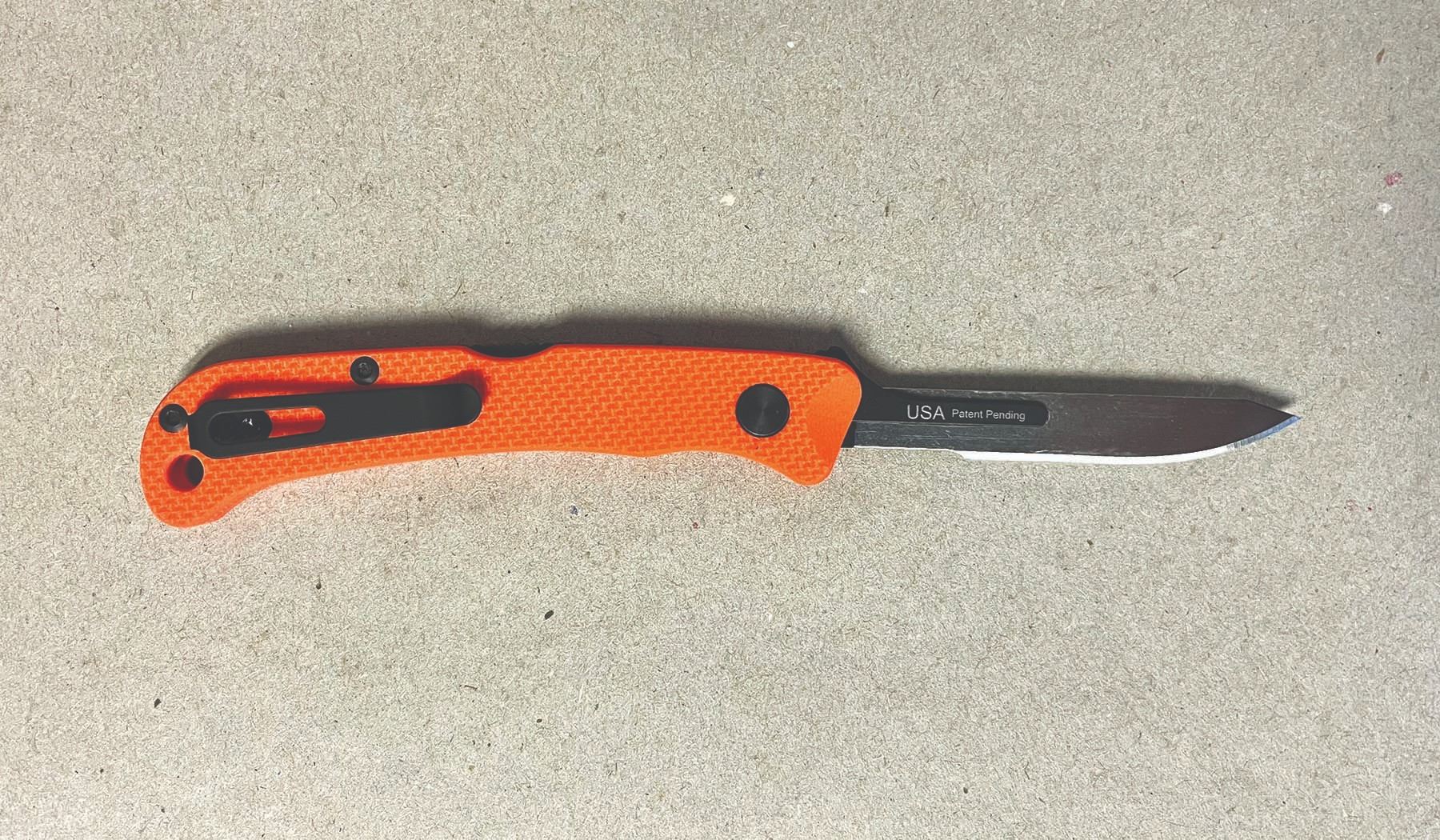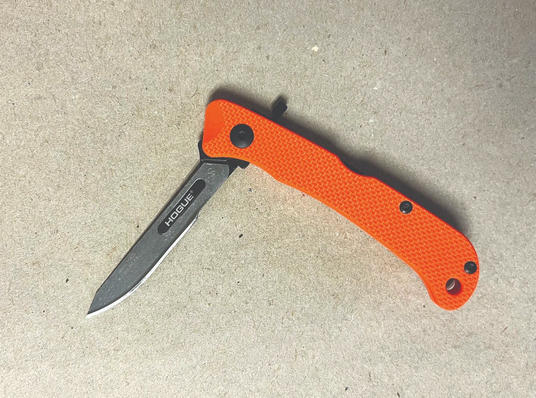body in solid orange with dual-action flipper tab that functions as a blade ejector.