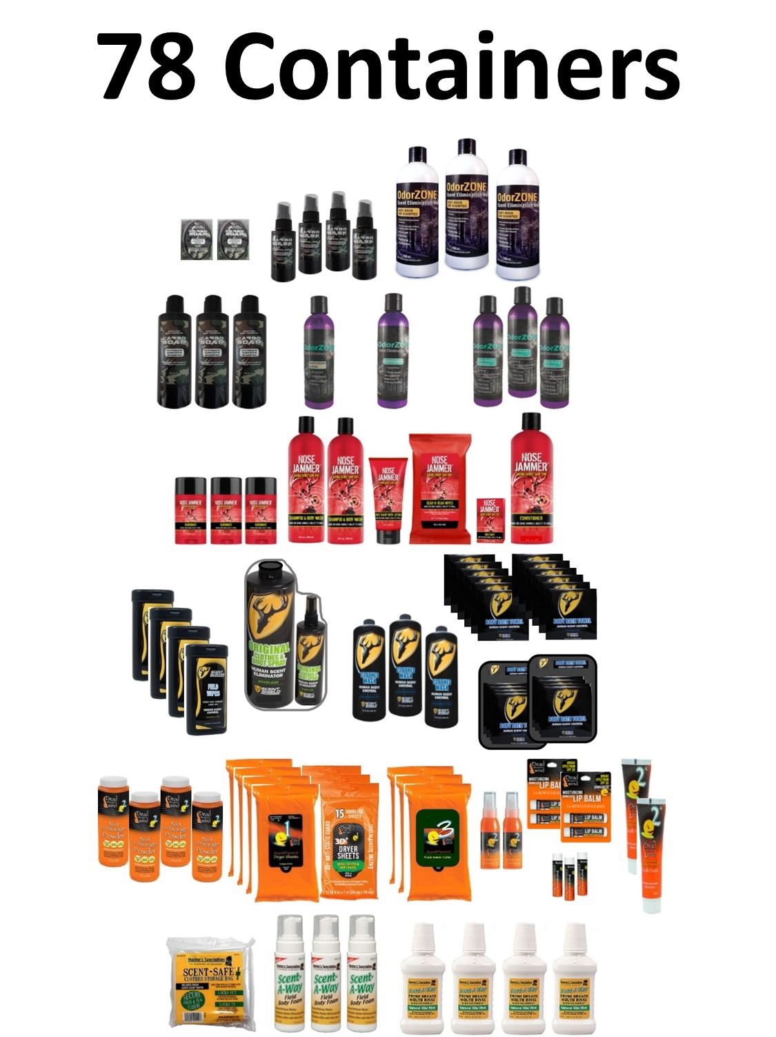 78 Pieces Scent Elimination, 9 x Carbomask, 2-Bar Soap, 4-Deodorant, 3-Shampoo, 8 x OdorZONE, 3-Body Wash 16 oz, 1-Lotion, 1-Conditioner, 3-Body Wash 8 oz, 9 x Nose Jammer, 3-2.25oz. Deodorant, 2-Shampoo, 1-5 oz Face Lotion, 1-All Purpose Wipes, 1-Bar Soap 6oz. , 1-Conditioner 16oz, 20 x Robertson Outdoors, 4-Field Wipes 20 Pack, 1-Scent Shield Combo, 3-Clothes Wash, 10-Bath Towel, 2-Bath Towels 4 Pk, 24 x Dead Down Wind, 4-Powder 4 oz, 7-Dryer Sheets 15ct, 4-Wash Cloths 20ct, 2-Mouth Spray 2oz, 5-Lip Balm, 2-Tooth Paste, 8 x Hunter Specialty, 1-Clothing Bag, 3-No Rinse Foam, 4-Breath Wash