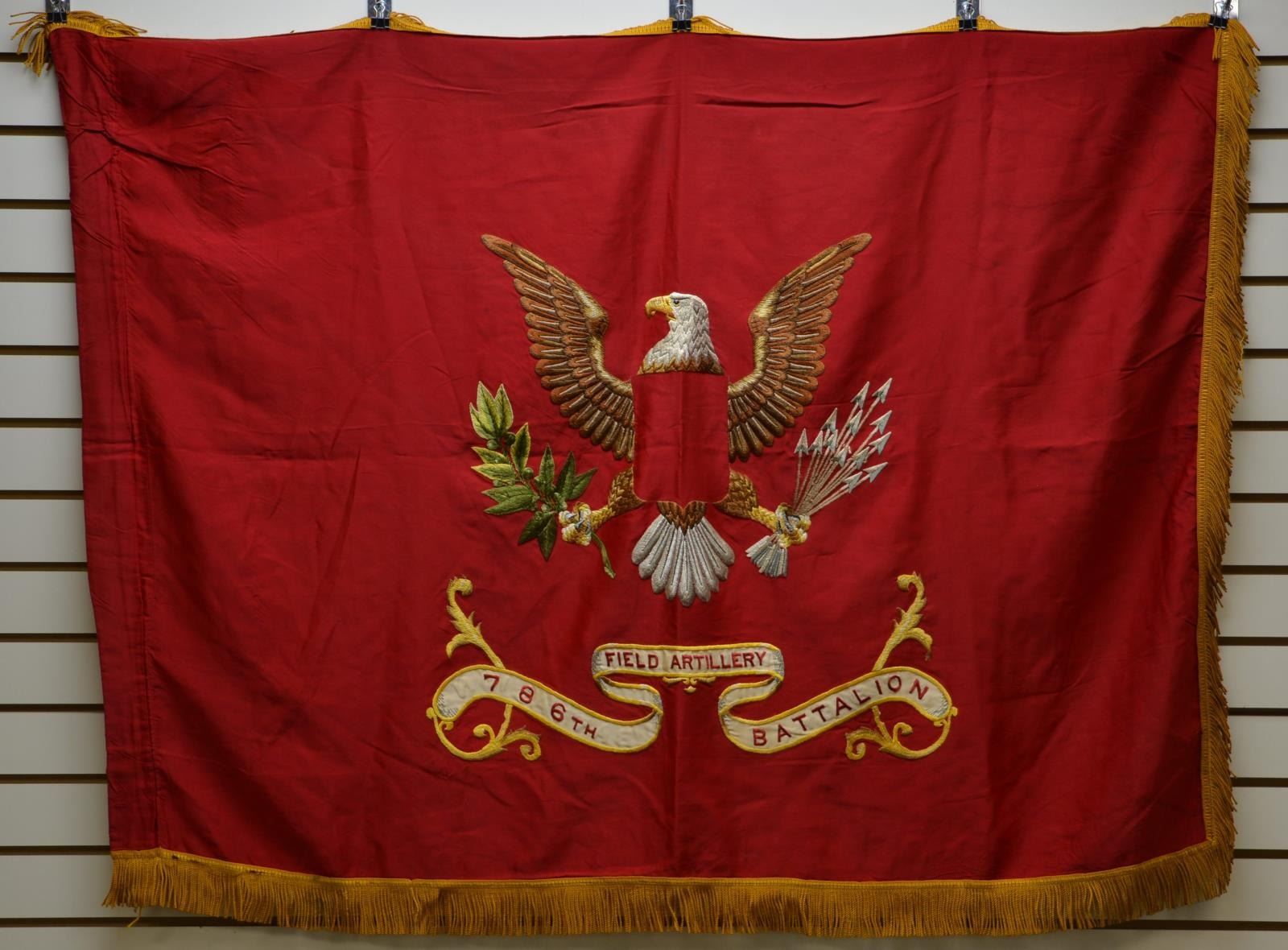 3’ x 4’ double applique embroidered on traditional artillery red field, circa WW2. Battalion was formed in 1942 and served until 1959. In 1944, the unit was posted to Fort Leonard Wood in Missouri before being sent to the Pacific Theater. The battalion saw action in the Philippines including in the Leyte Campaign. Philadelphia Quartermaster Contract label dated "2-27-1". CONDITION: fine overall. (02-17547-17/JS). $100-200.