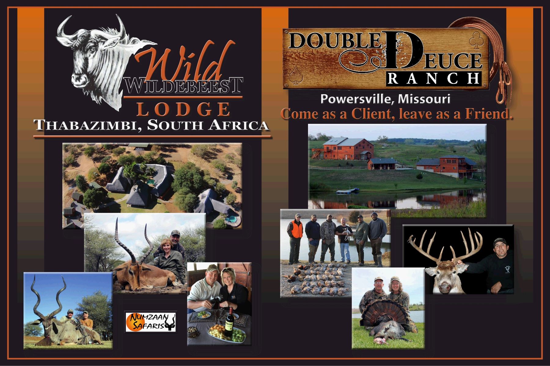 Mike and Karen Helbing, owners of the Double Deuce Ranch in Missouri and owners of the Wild Wildebeest Lodge in South Africa, are donating an 8-day Combo Hunt: 3-night/2-day Missouri Pheasant-Quail-Rabbit Hunt with a 5-day South African Safari. Note that both hunts must be taken.