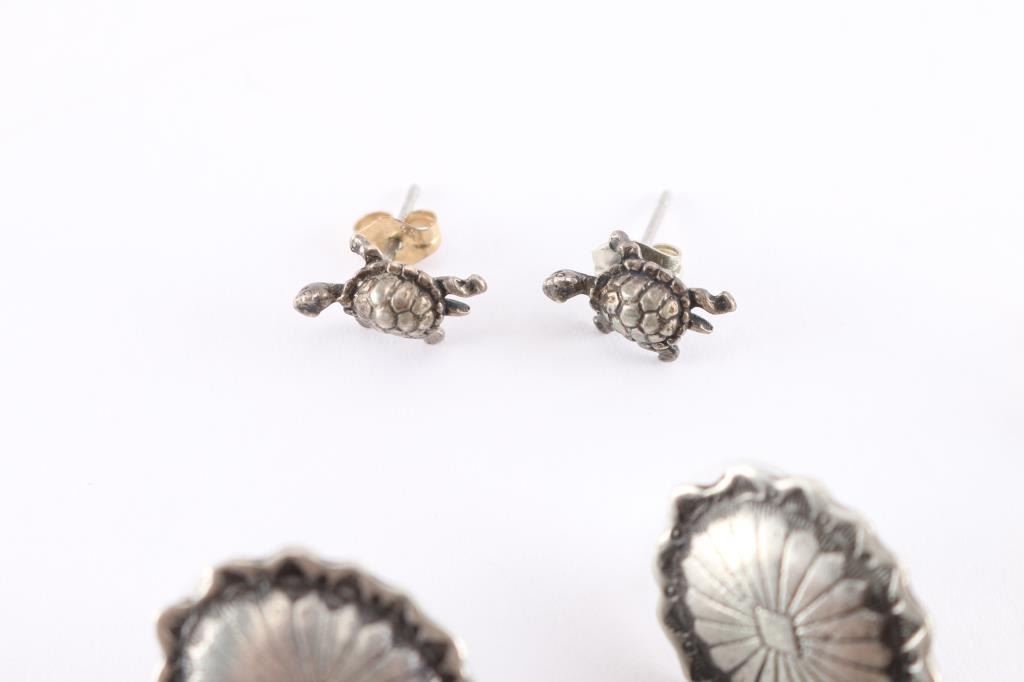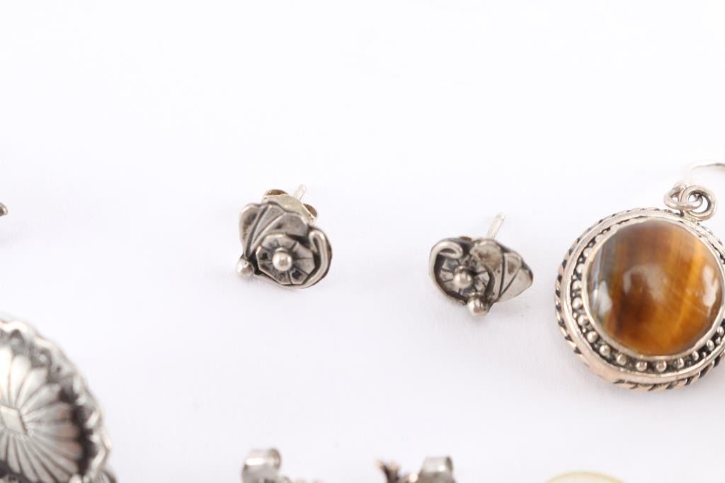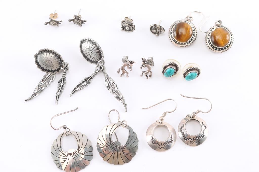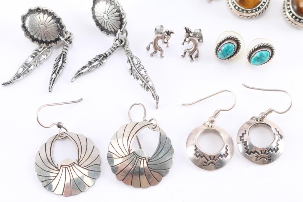All pierced, includes one turquoise pair, one tiger's eye pair. Most are maker marked and native American made.