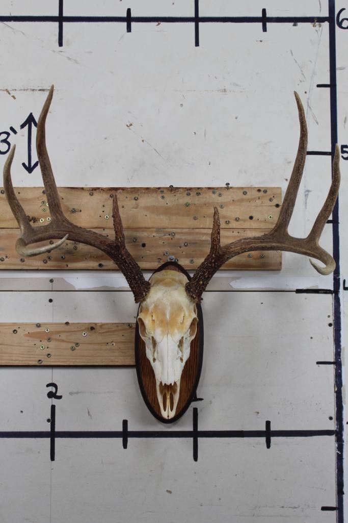 BIG and Symmetrical 8-Point WHITETAIL DEER Skull with a 24.5" Spread and All its Teeth. It is mounted on a wooden plaque. TAXIDERMY