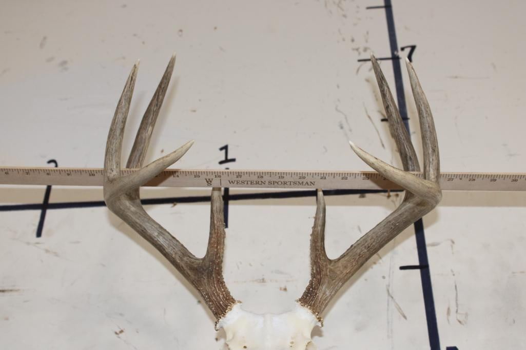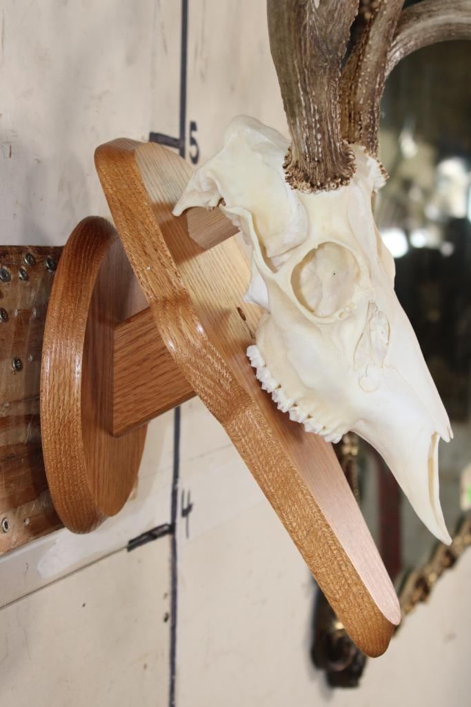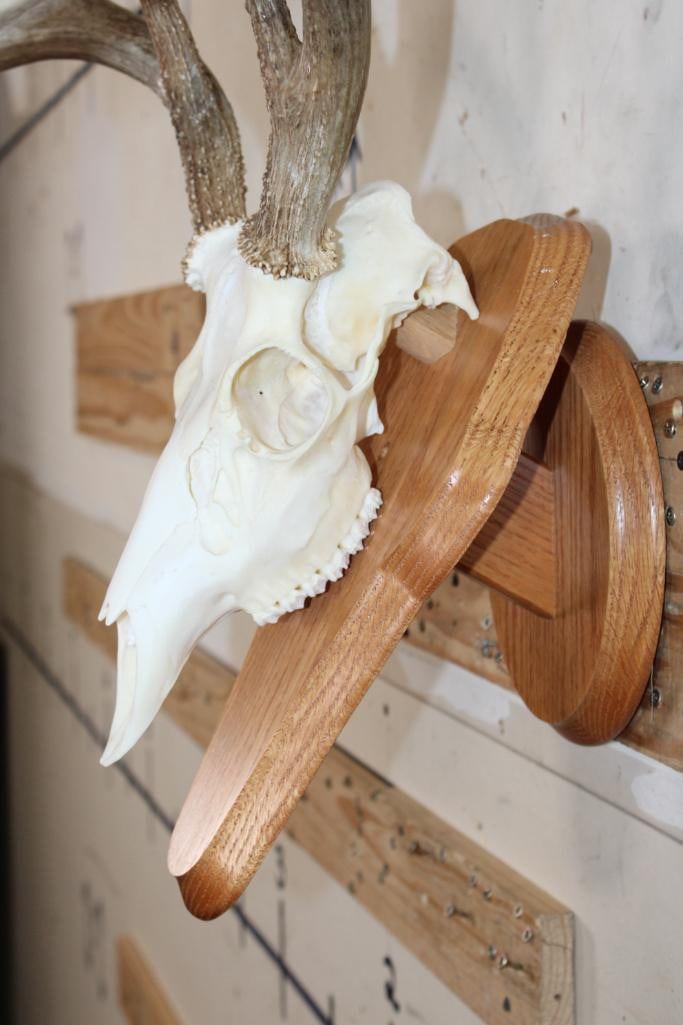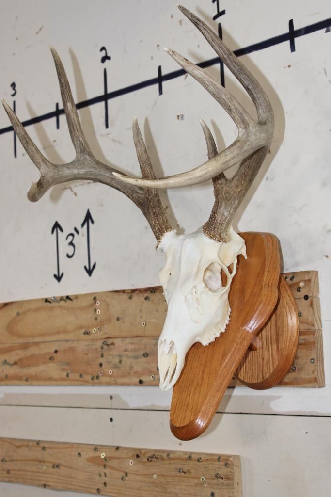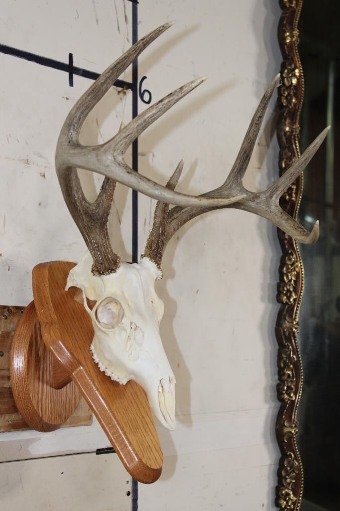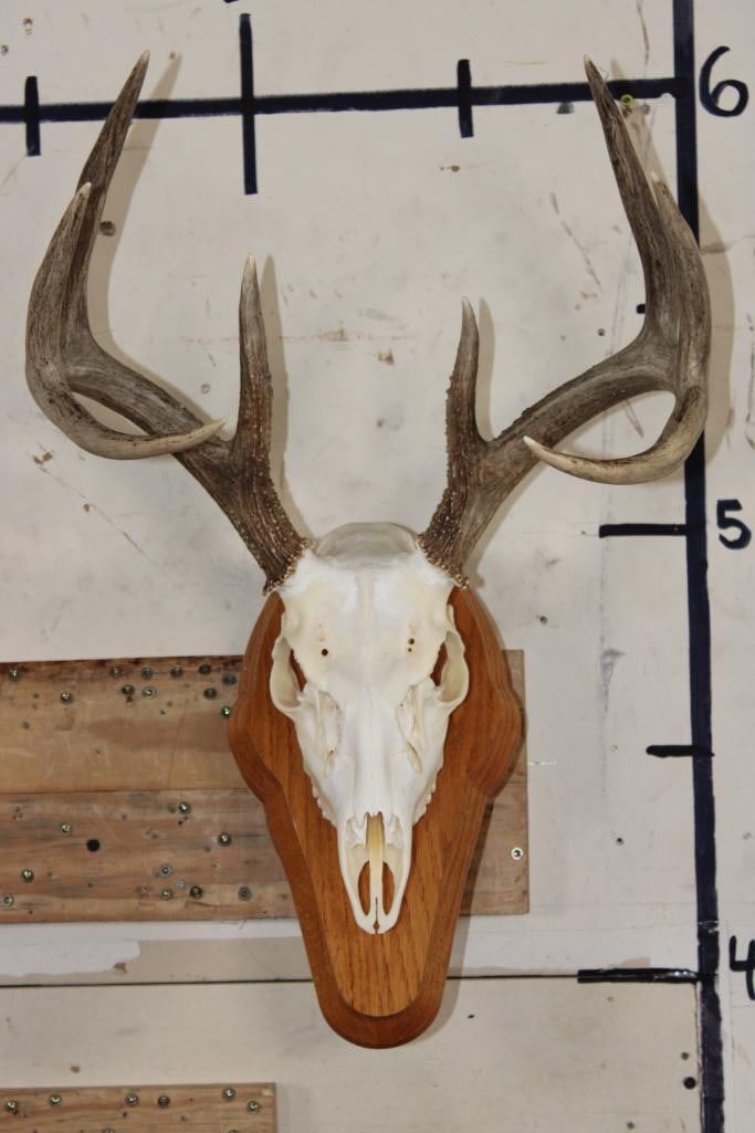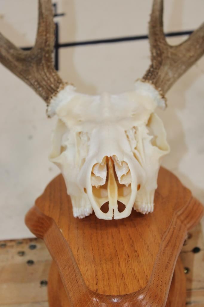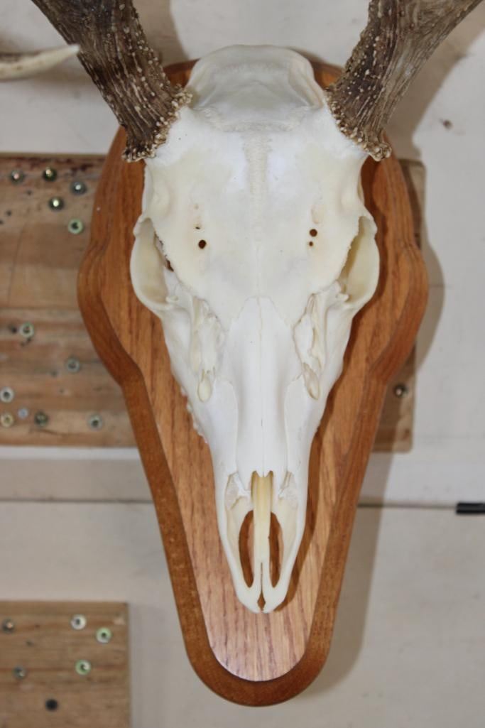 Very Nice and Clean 8-Point WHITETAIL Skull with All its Teeth. It has a 16" Spread and is displayed on a Wooden Plaque. TAXIDERMY