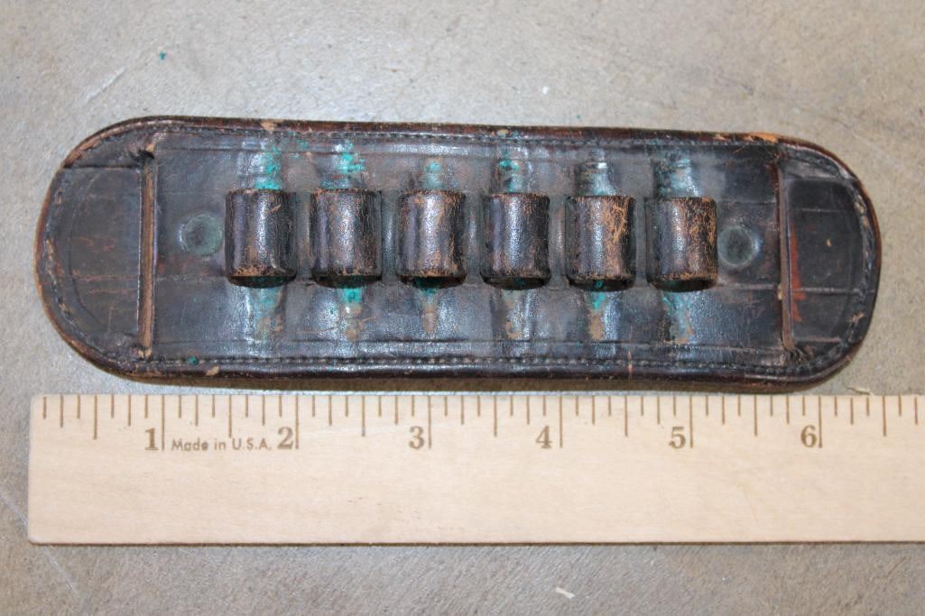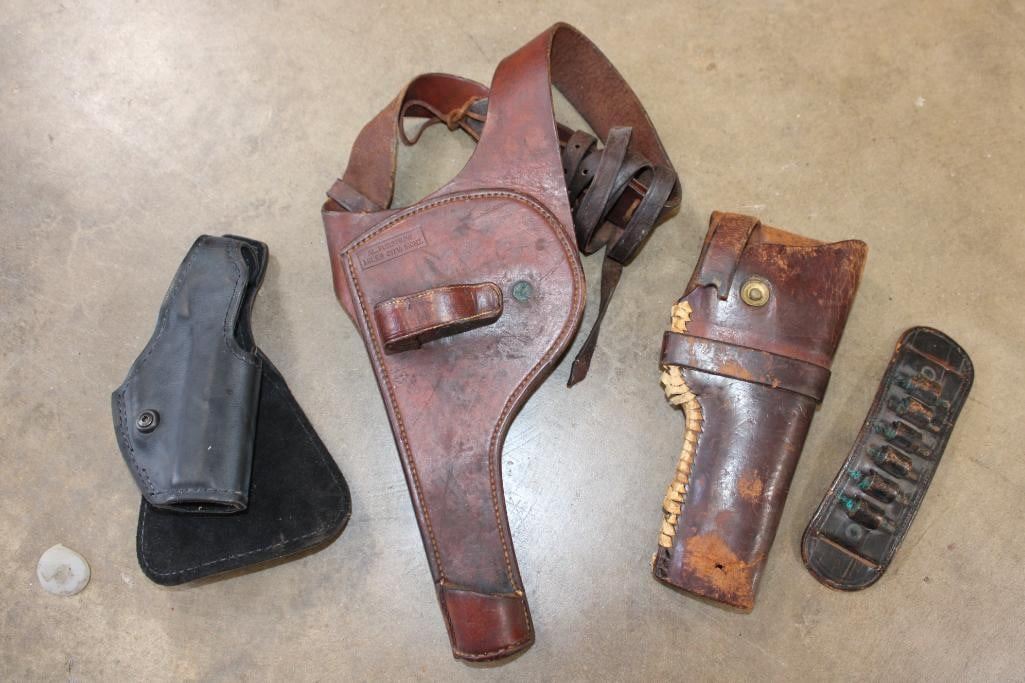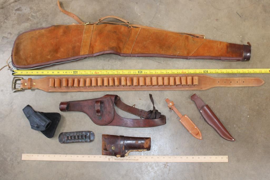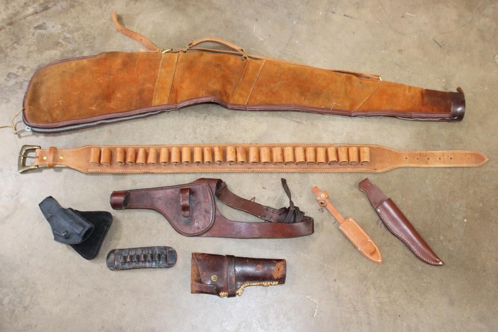 1 Vintage Leather RIFLE CASE, 1 Shell Belt for 12 ga., 3 Holsters, 2 Leather Knife Sheaths, and a Leather Bullet Holder for a Belt (ONE$). GUN HOLSTERS AND ACCESSORIES