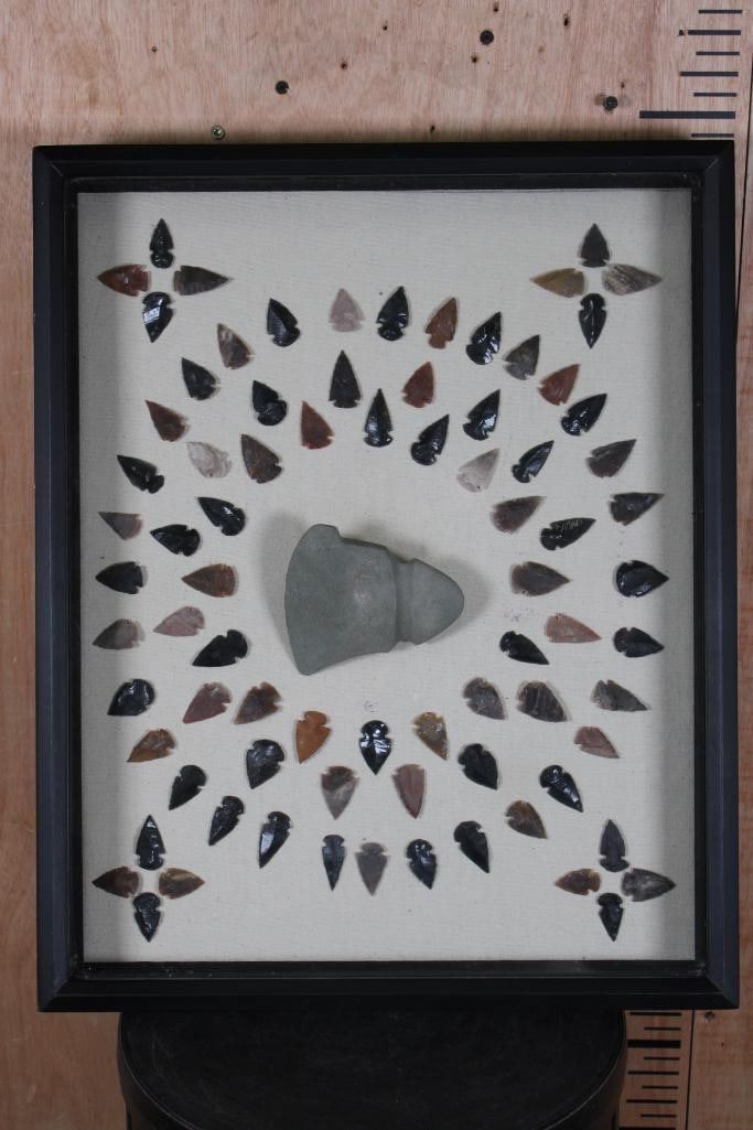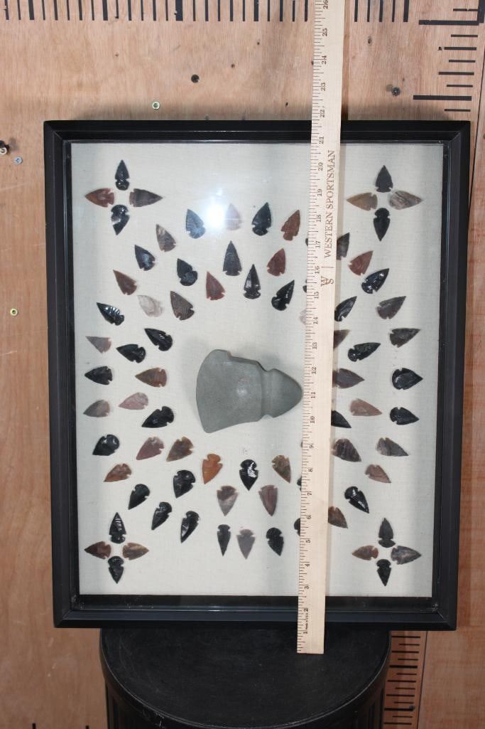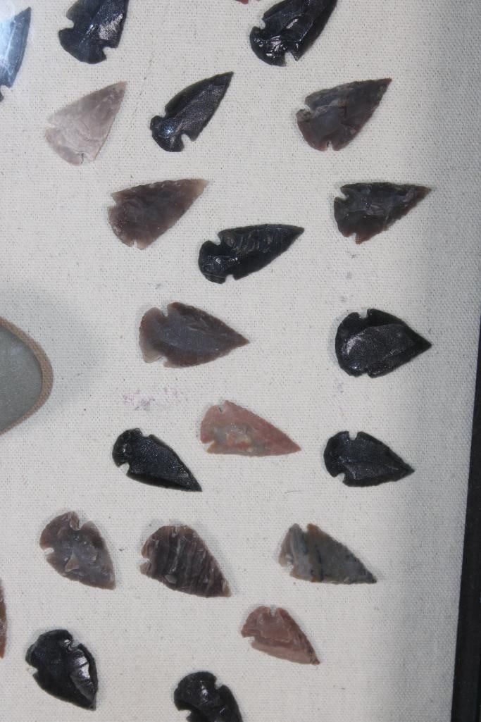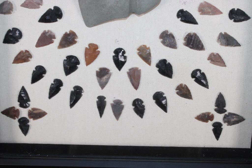 (80) Contemporary ARROWHEADS or Bird Points and (1) AXE Head in a Display Case