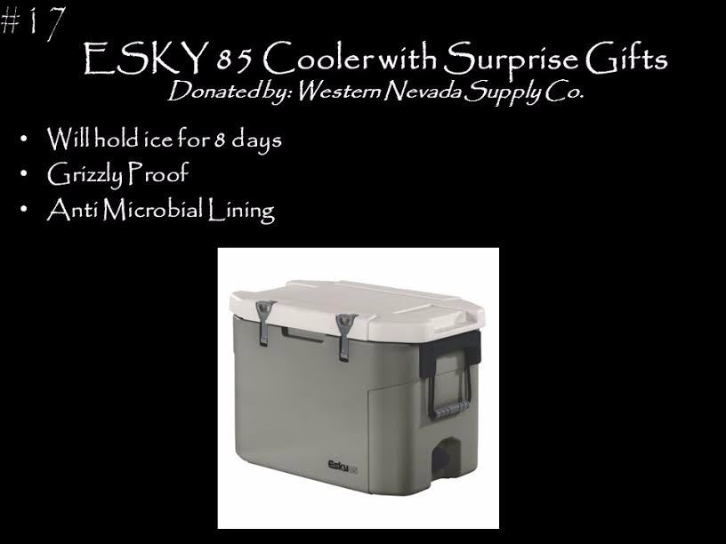 85 Quart ESKY Cooler with Unknow Contents. This cooler holds ice longer than a YETE, on a side by side hunt. This is a top of the line cooler for those extended hunts or family outings. The cooler is keeper, but the question is “WHAT ARE WE HIDING INSIDE”? Donated by Western Nevada Supply Company