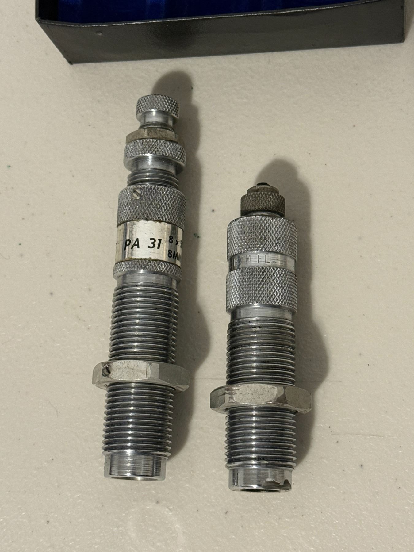 Vintage Lyman All-American (A-A) Deluxe 2-die rifle set in 8mm, complete with original box. Dies appear clean and well cared for. A great addition for reloaders or collectors of classic Lyman equipment. Condition as shown in photos.
