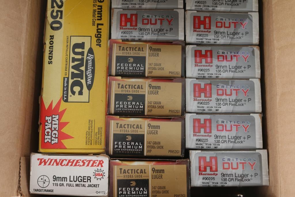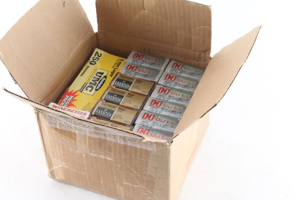 Approx. 1000 rounds of 9mm factory new ammunition. Various makers, Federal, Remington and others. All in factory boxes.
