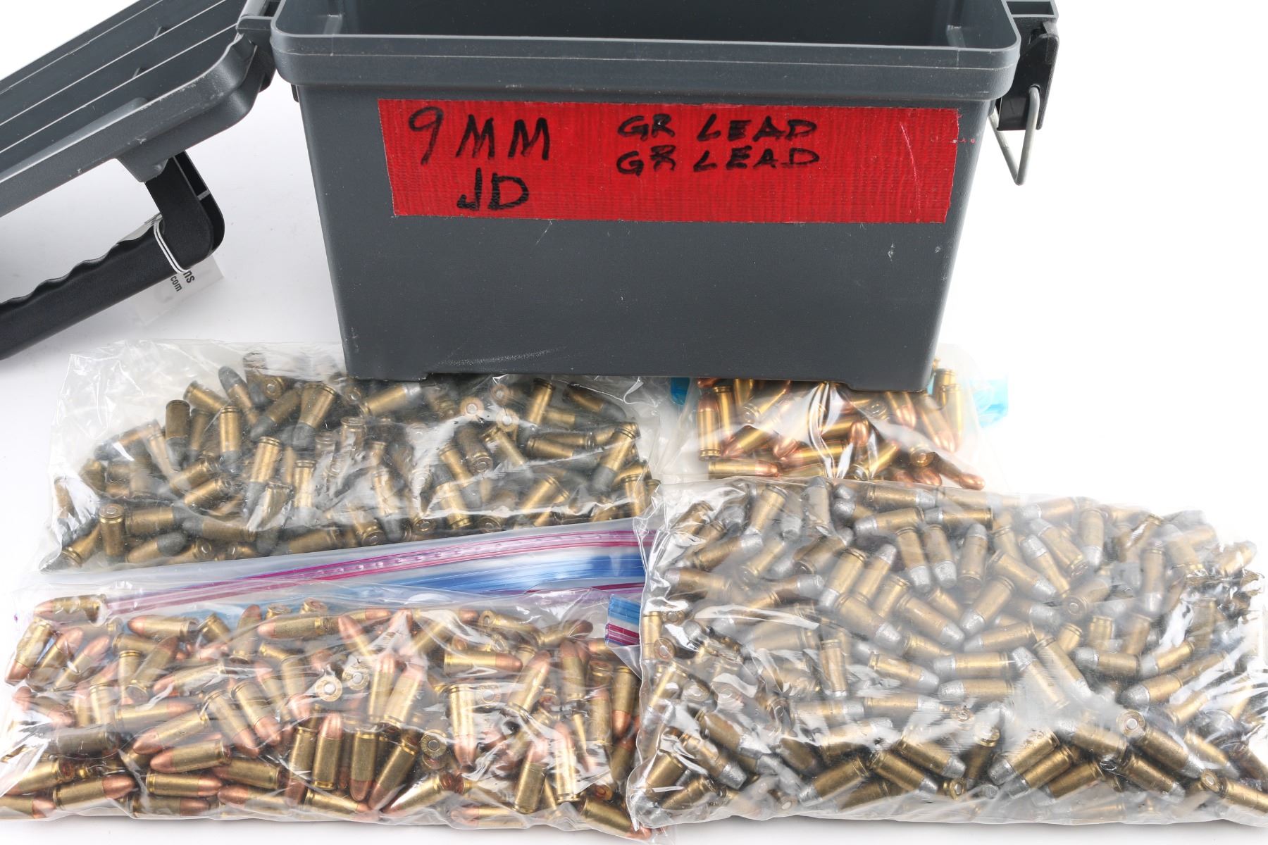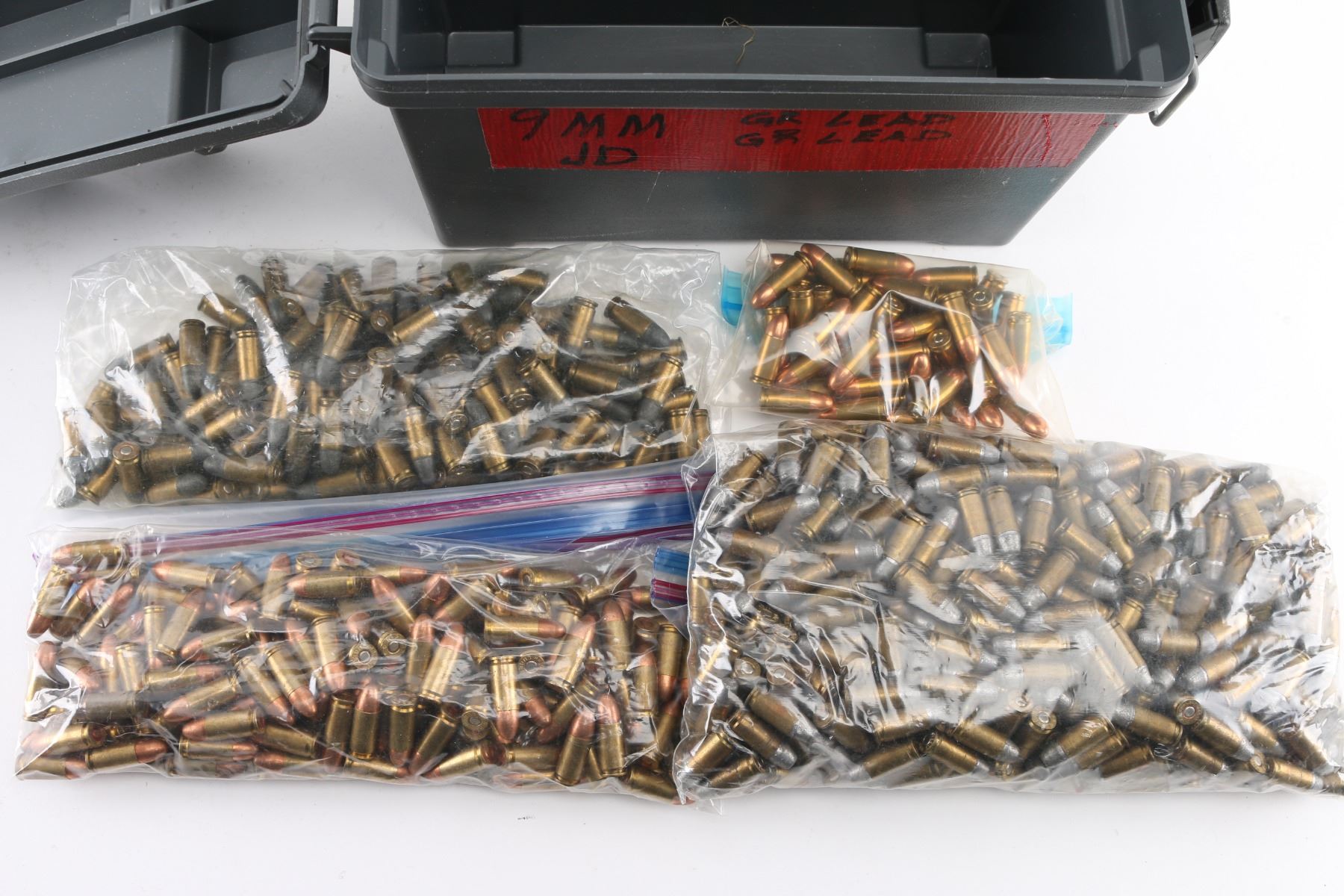 mostly lead bullets, some loaded with FMJ. Weighs over 20 pounds.
