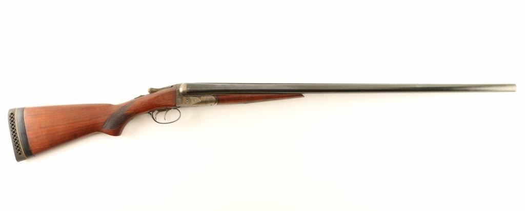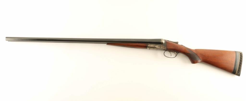 Double barrel (side by side) shotgun chambered for 12 gauge 2-3/4" shells. Features approx 30 inch barrels, selective ejectors, double triggers, manual safety, brass front bead, rear bead located close to breech (top is broken off), fixed chokes. Stock has semi-pistol grip shape with checkered panels, two 1/4" plastic spacers to increase length of pull, and a ventilated rubber recoil pad. Matching forend has a single checkered panel across bottom. Length of pull is approx 14-1/8", drop at comb is approx 1-7/8", drop at heel is approx 2-3/8". Bores are bright; could use cleaning. Barrel retains 90% blue with several scratched areas, bare metal at edges of top rib and muzzle, and on sides at breech. Several bulges observed in left barrel (one major bulge at 8.5" from muzzle, one smaller at 16" from muzzle). Muzzle of right barrel is dented. Left barrel measures as "Modified" choke, right barrel is out-of-round from dent so choke cannot be properly measured. Triggerguard shows bare metal at edges and beginning of patina across bottom. Case color on receiver is very good on rear half, with thinning and plain metal beginning to show on front 2" at bottom from handling. Wood is in very good condition with many shallow dents and some scratches. Rear trigger can fire when safety is engaged. Condition is NRA Poor ***C&R Firearm***