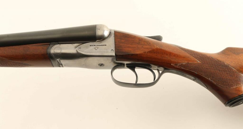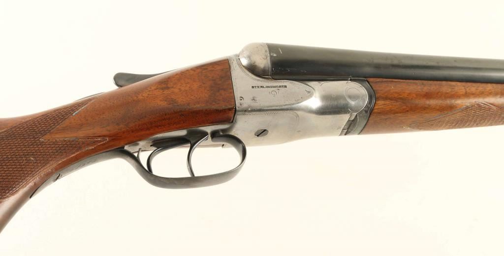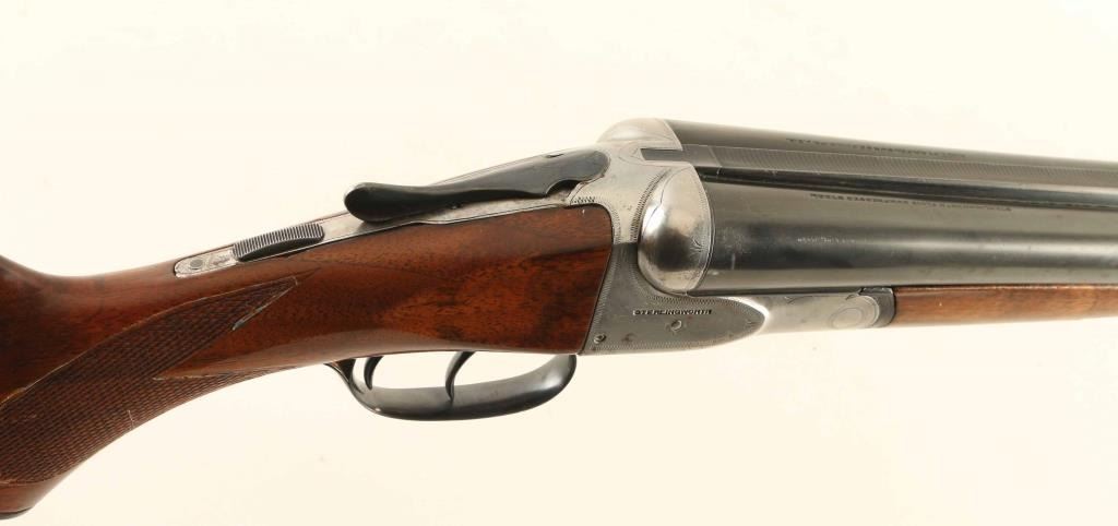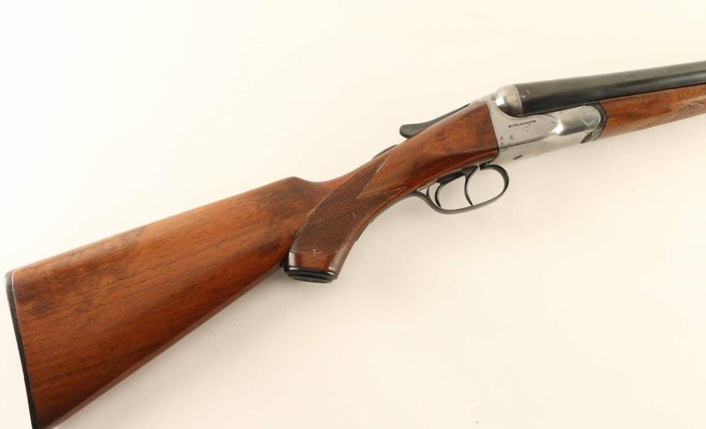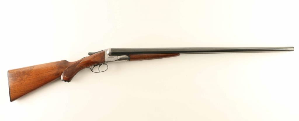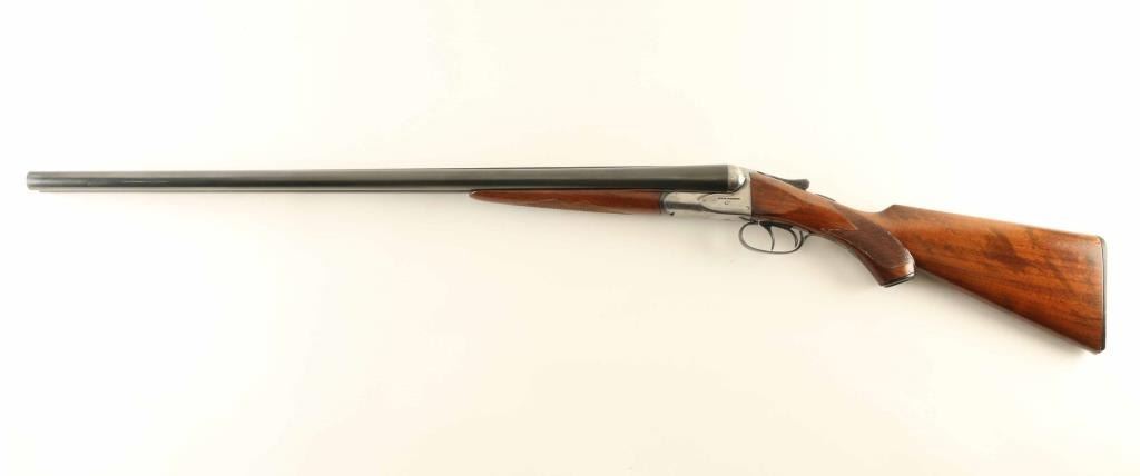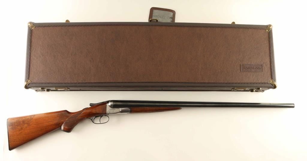 SxS double barrel shotgun made circa 1915-1919. Features blued finish on barrels & triggerguard, silver colored receiver, 28" barrels with raised matted rib, Full (L) & MOD (R) chokes, steel front bead, double triggers, tang safety, single piece extractor, wood splinter forend with checkered panel across bottom, curved grip wood stock with checkered wrist, black composition buttplate & grip cap. Bores are very good. Retains 90% re-blue, with few noted clusters of pitting under blue, triggers and top latch show hardly any loss. All observed numbers match. Barrel markings readable with some dishing to edges. Wood is good serviceable condition, varnished, tiny crack visible at tang, checkering deepened at borders, staining under finish indicates careful sanding, slight rounding of sharp edges & corners. Buttplate is good with some chipping loss at toe. Approx stock dimensions: 14" Length of Pull, 1-5/8"" Drop at Comb, 3-1/8" Drop at Heel. Barrel address: "MADE BY AH FOX GUN CO PHILA PA USA". Includes new condition "SportLock" luggage style case with leatherette cover, faux antique hardware.