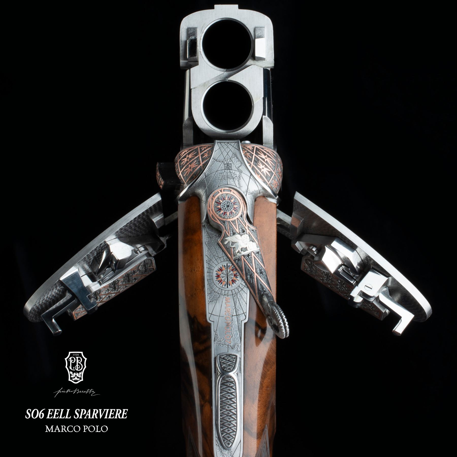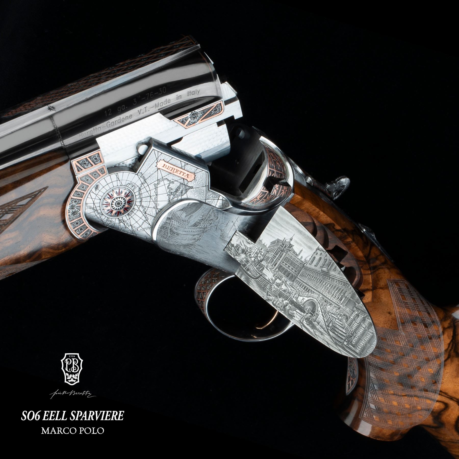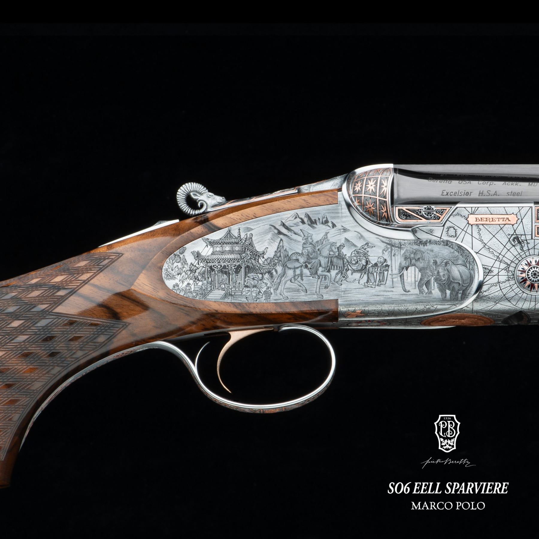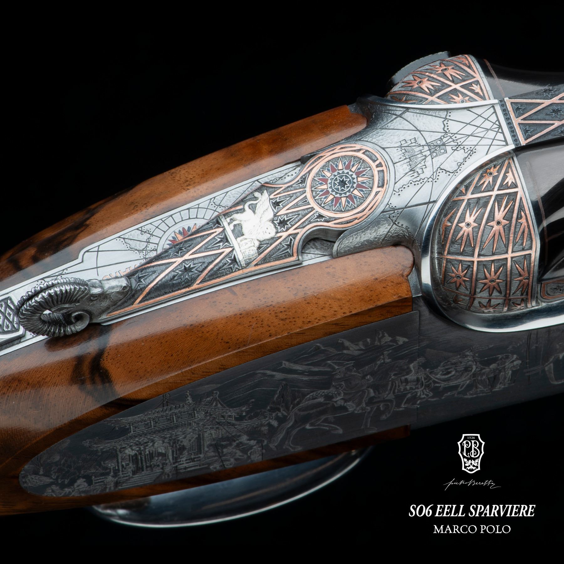 Pietro Beretta SO6 EELL Sparviere Marco Polo one of one created to honor the 700th anniversary of Marco Polo’s passing, this one-of-a-kind 12-gauge celebrates exploration and discovery through 3,500 hours of master engraving and craftsmanship.