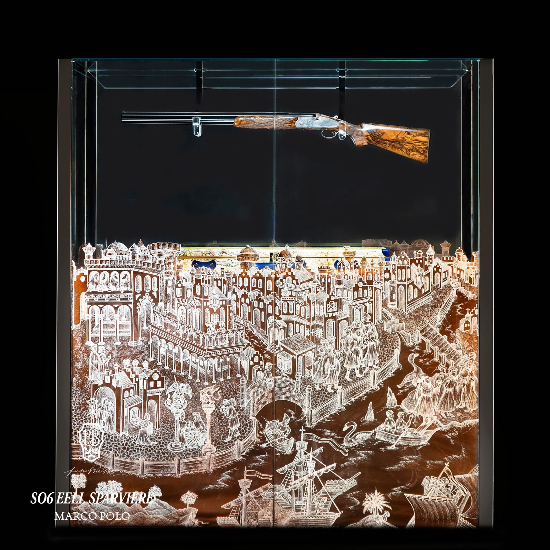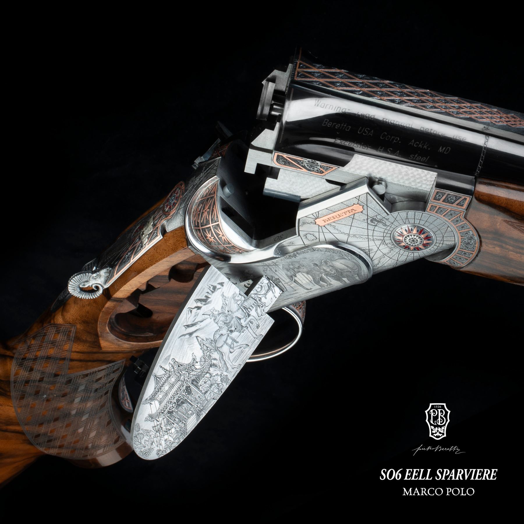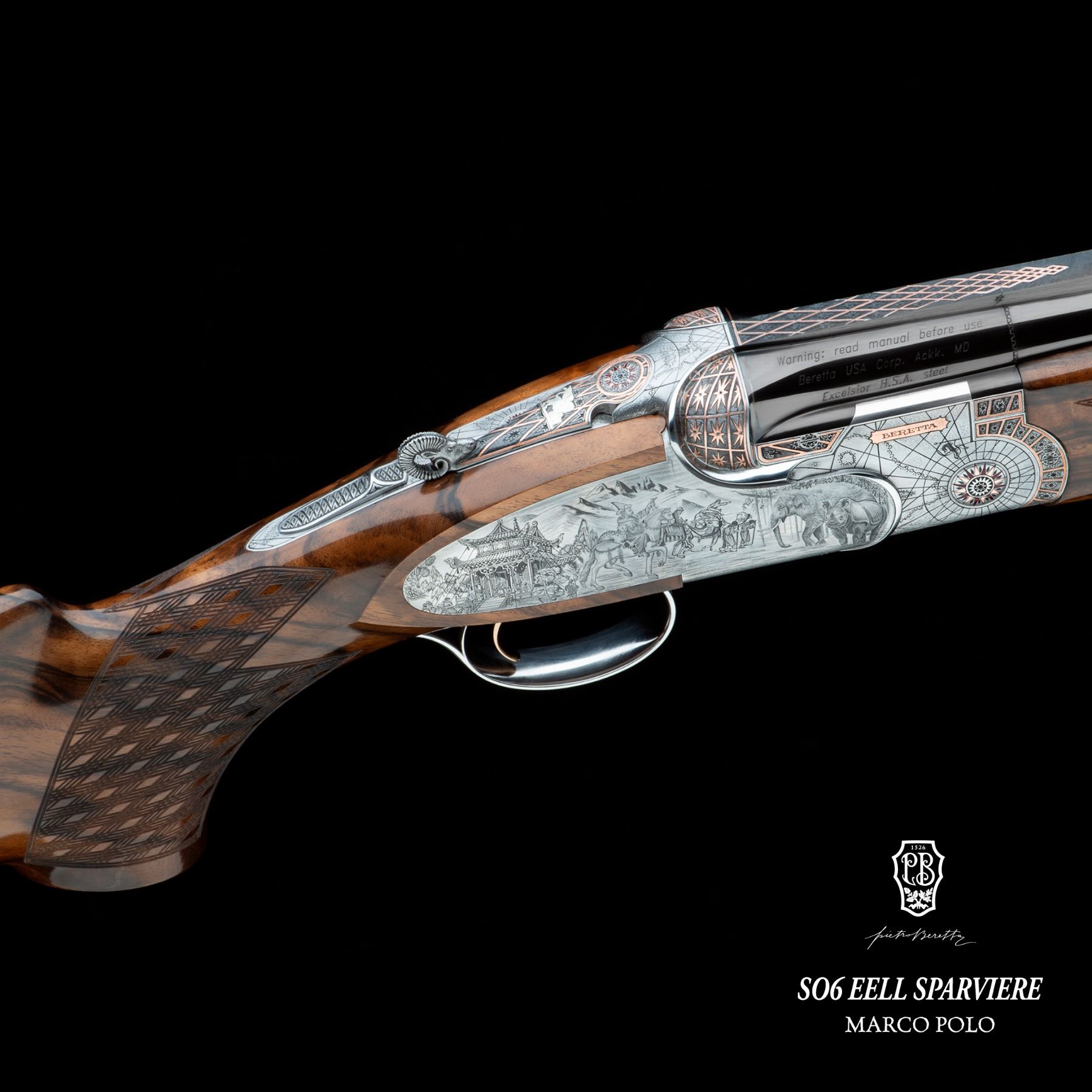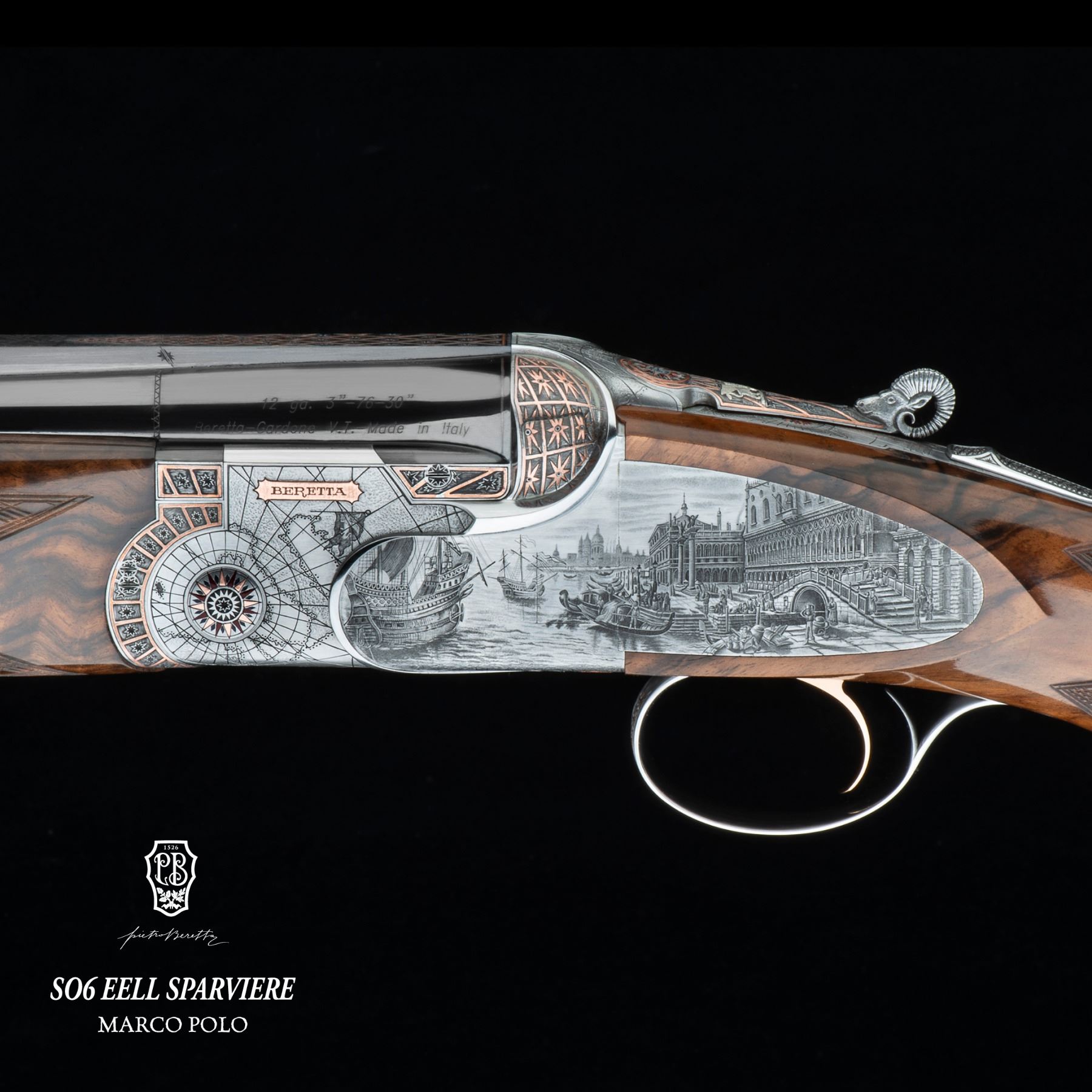 Pietro Beretta SO6 EELL Sparviere Marco Polo one of one created to honor the 700th anniversary of Marco Polo’s passing, this one-of-a-kind 12-gauge celebrates exploration and discovery through 3,500 hours of master engraving and craftsmanship.