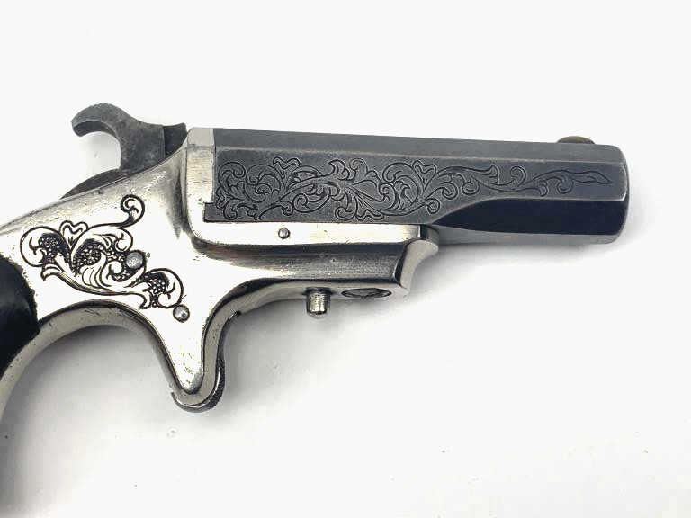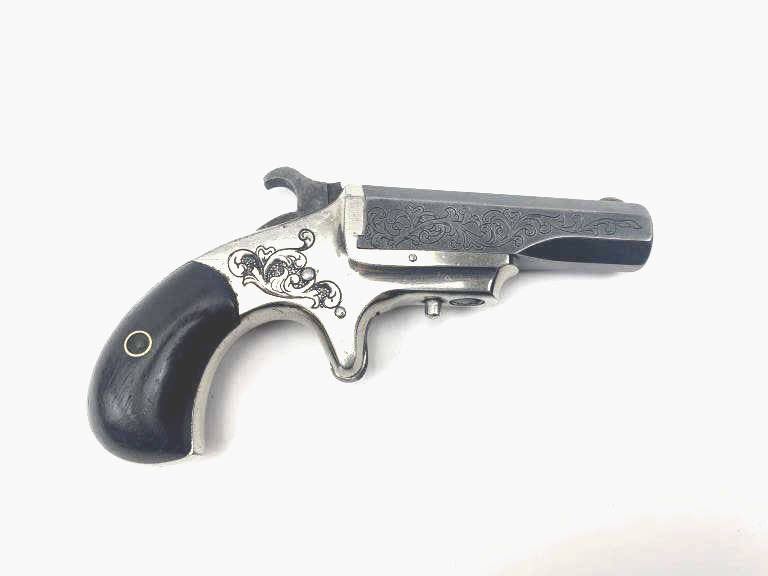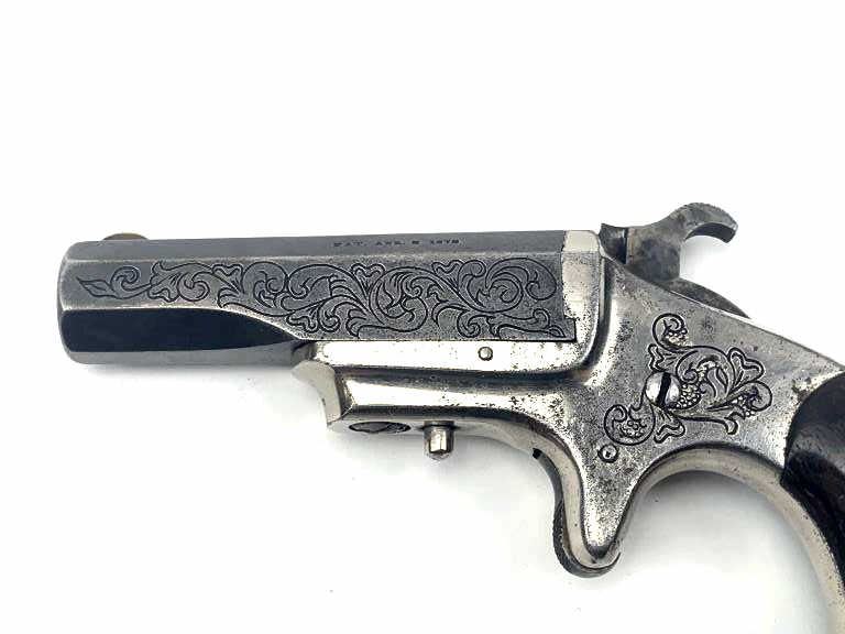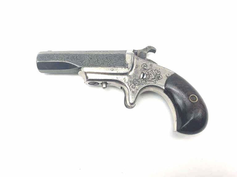 A Scarce Engraved Marlin .41 Caliber Derringer with Rosewood Grips. Serial Number 1588. 41 rimfire with floral engraved 2 and 9/16th inch blued octagonal barrel. Flayderman states approximately 2000manufactured. “Frames usually plated with barrels blued” as on serial 1588. Top of barrel marked “XL DERRINGER”. Iron frame engraved with scrolls retains 90% bright nickel. Engraved barrel retains most of anold soft blue. Rosewood grips with 60% original varnish. Hammer with traces of casehardening. Strong action. A very attractive engraved 1870’s cartridge derringer. Est.: $900-$1800