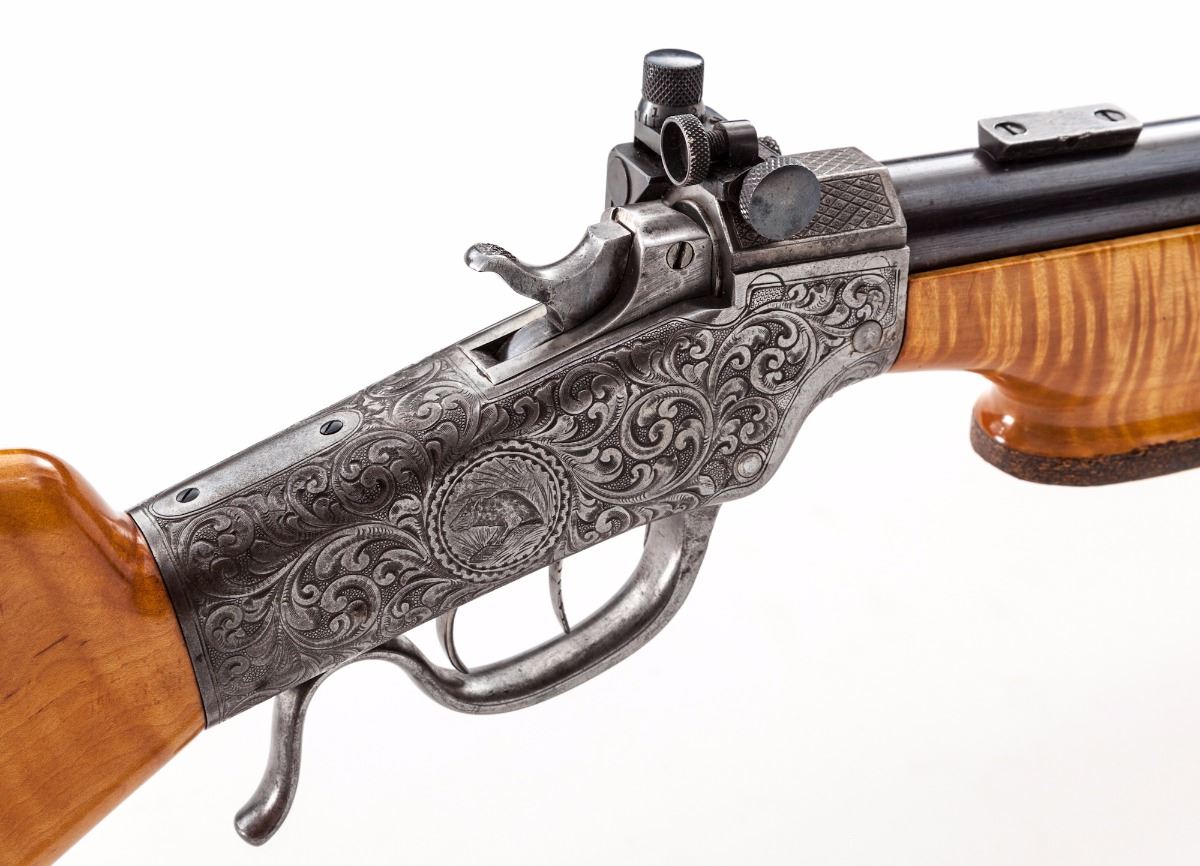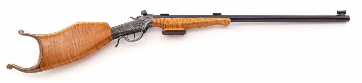 A. W. Peterson, Denver, Colo. Custom Schuetzen Rifle, #4685, .22 LR cal., 28'' blue finish barrel with two target scope blocks and globe front sight; barrel is drilled and tapped for an additional block mounting location. Rifle is built on a case colored Ballard Number 3 action having early period full coverage vine scroll and punch dot engraving, with circular small game cameos on the sides, double-set trigger, and a Lyman Number 33 peep sight; top tang is drilled and tapped for a vernier sight. Stock is satin-finished tiger stripe maple with a high saddle comb and contoured palm rest capped in varnished cork, with brass Schuetzen buttplate. Weight is 12-7/8 lbs. Condition is very good with visible rifling and dark bore. Double-set trigger needs adjustment or repair; modifications have added additional screws to the receiver. Barrel blue is approx. 95%, and case colors have turned to dark gray with a few traces of color remaining. Est.: $2,500-$3,500. (Antique)