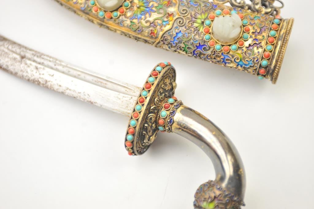 A beautiful Chinese Qing Dynasty Jade, Coral, Turquoise and enamel mounted silver gilt dagger. Measures 13” overall with a 7” fullered blade. This is a work of art for a cabinet. Scabbard is elaborately decorated in enameled cloisonné with jade foo dogs surrounded by coral and turquoise stones. The silver hilt is beautifully enameled. The oval guard is decorated with alternating coral and turquoise beads. The condition isoutstanding. A New York auction had a similar Chinese dagger in its October 2018 sale estimated at $1500-$3000. Ours is better in every way. Est.: $750-$1500