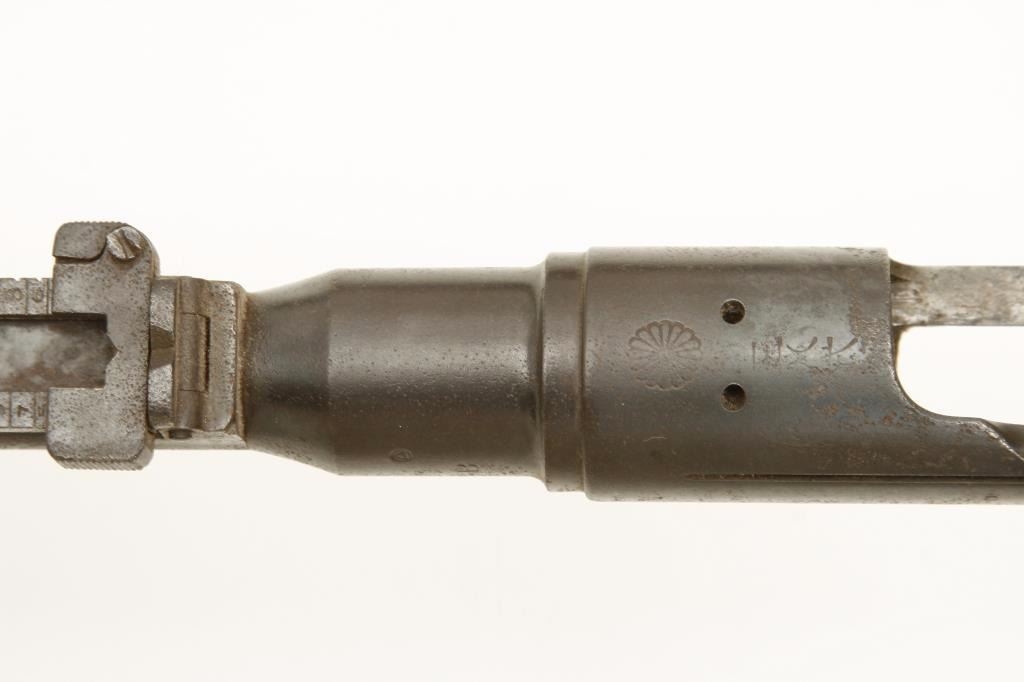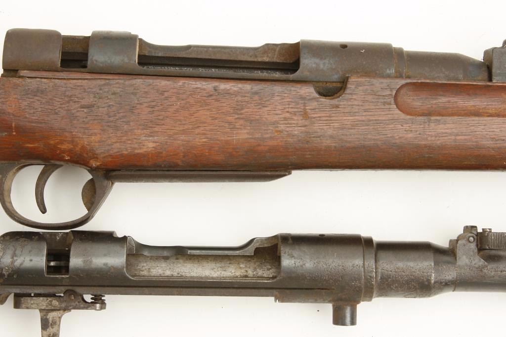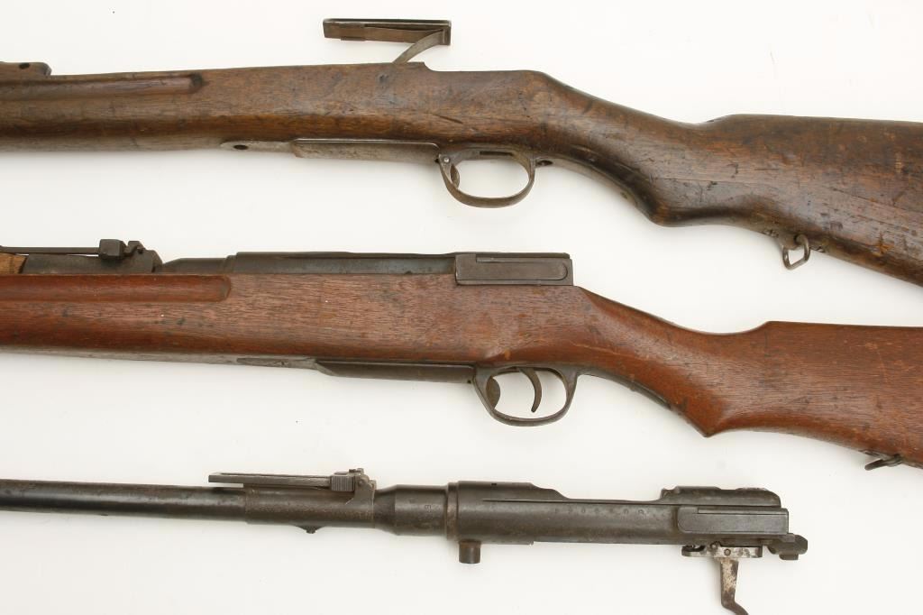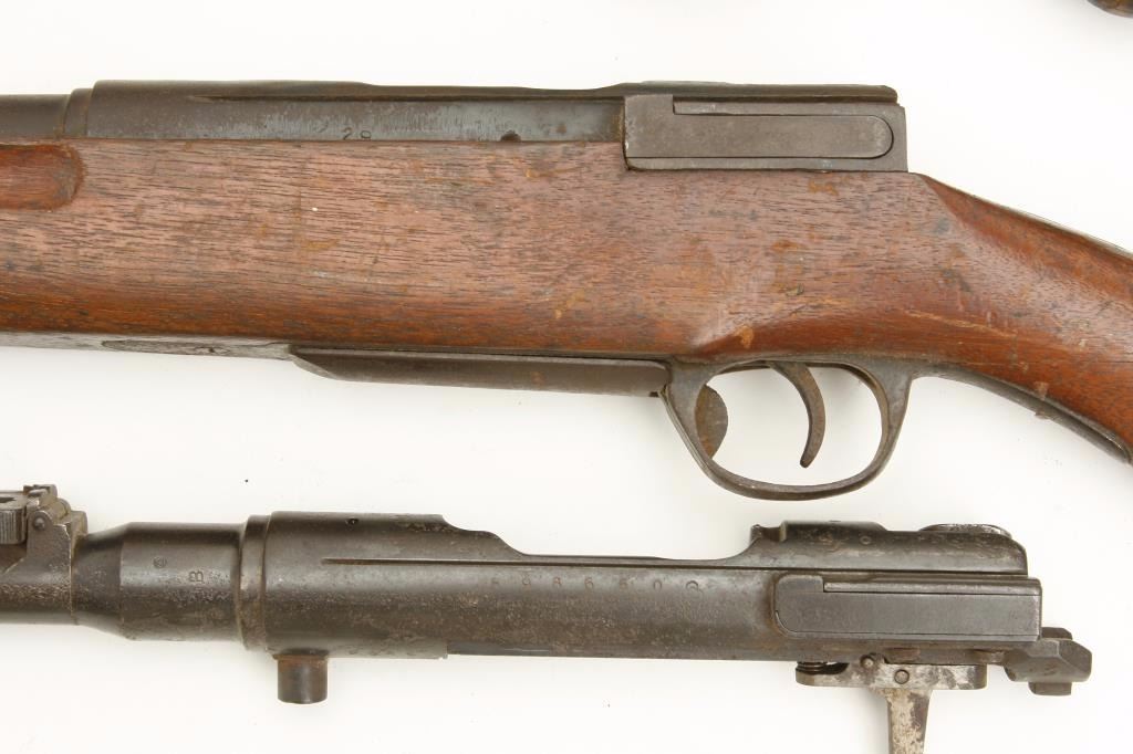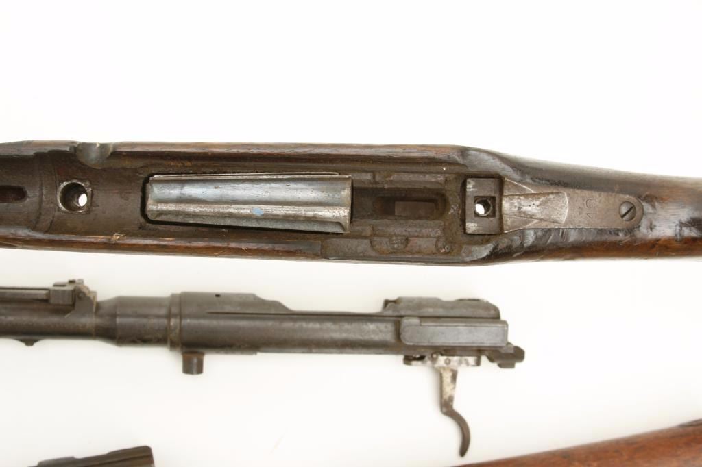 stocks. The lot includes 3 Arisaka stocks, one with the full barreled receiver included (serial #NSNV) with no bolt. There is an Arisaka barreled action (serial #598650) with no magazine assembly but a clear, crisp Mum proof. Additionally, the lot includes a Bishop commercial stock for a M1 carbine with roll over cheek piece. All stocks are in fair condition. A nice parts lot. (C+R) Est.: $100-$200.