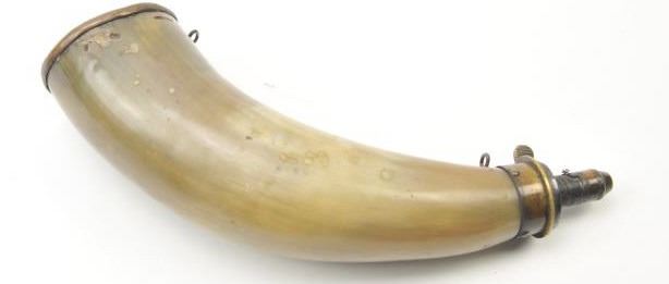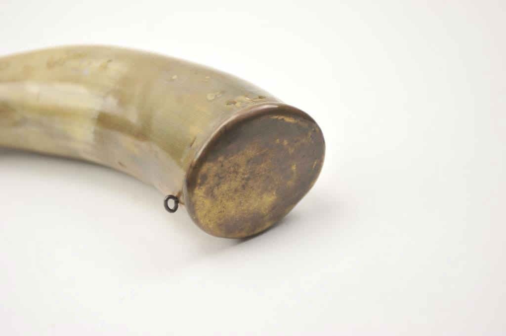 A large 19th century American or English powder horn with Dixon adjustable charger. Brass plug. Measures 11” overall. Good condition with slight worm damage. A very nice 19th century powder horn. Est.:$125-$250