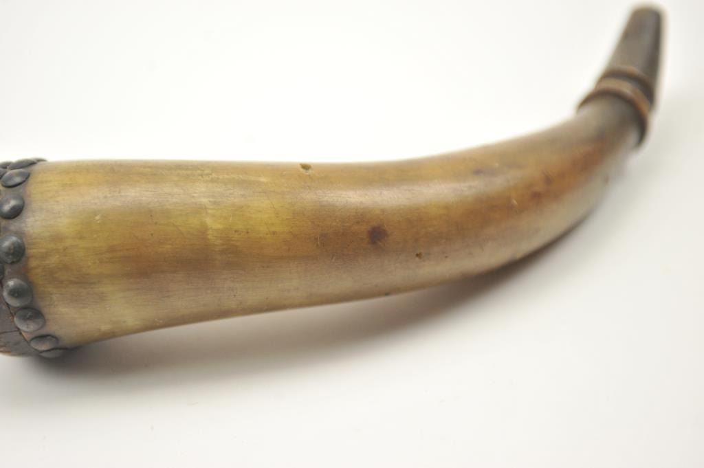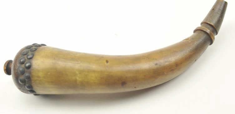 A large American tack decorated powder horn. 19th century. Measures 13 ½” overall. Finely turned with wood base plug made for carrying strap. Tacks show great age and horn has lovely age patination. Some horn worm damage. Has a great American “Frontier” appearance. Est.; $150-$300