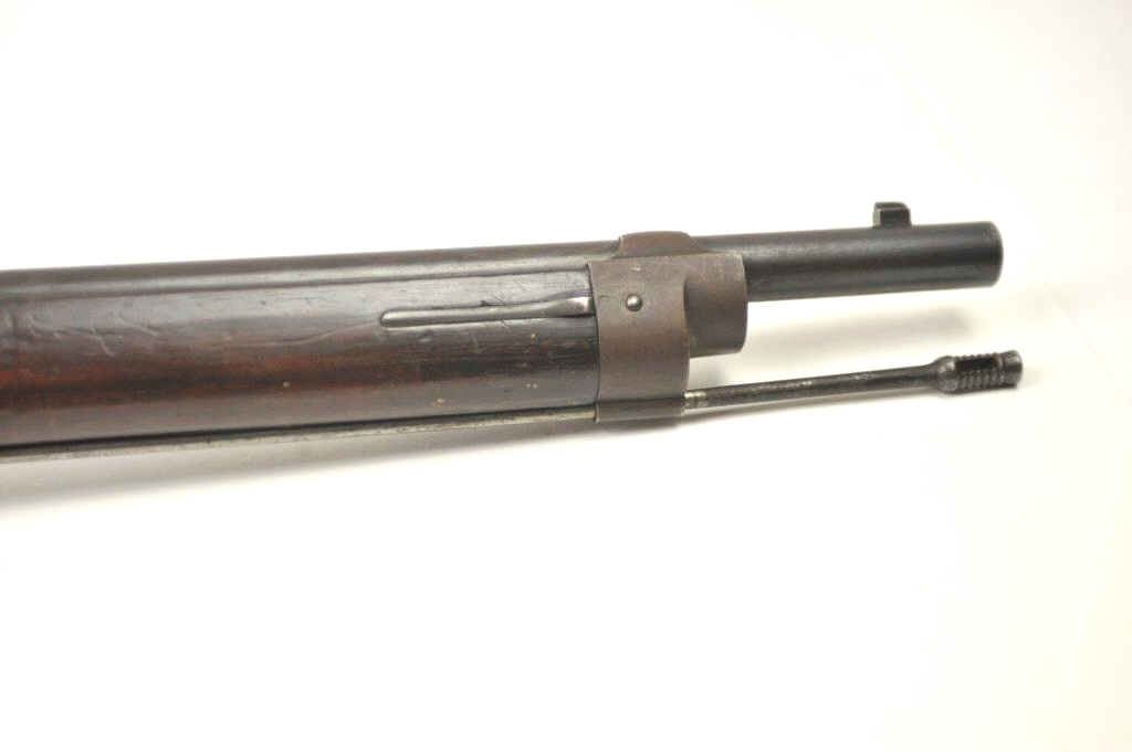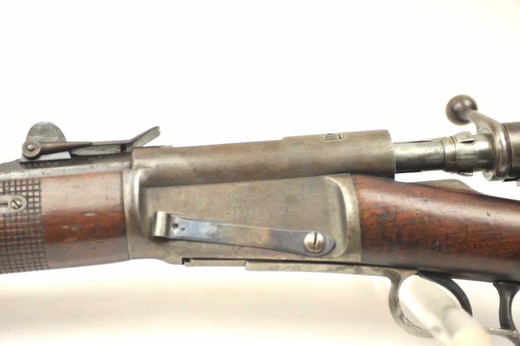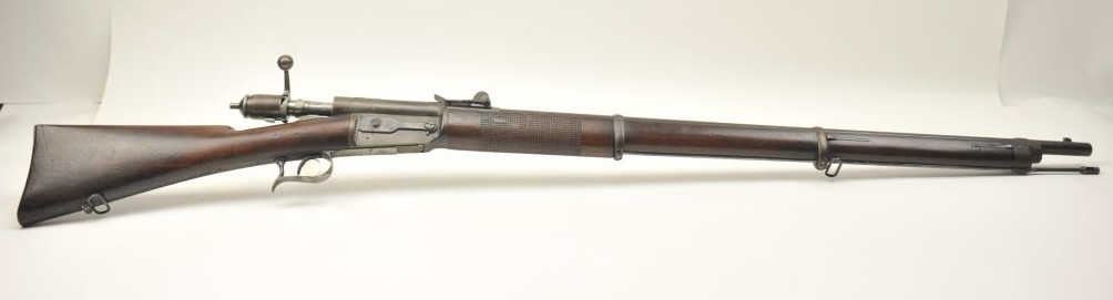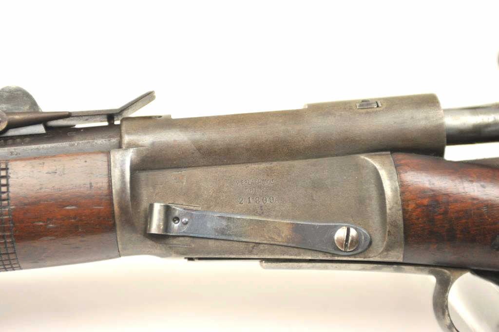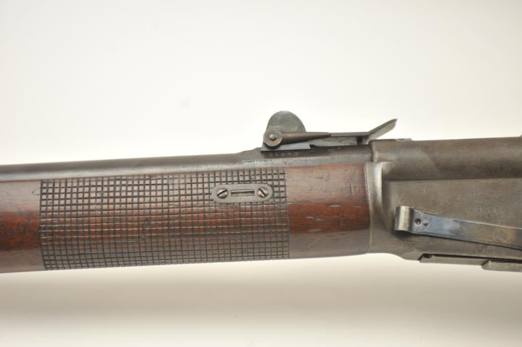 A rare Swiss Model 1869/70 Vetterli Rifle by V. Erlachu & Cie in Thun, S/N 21809 in .41 rimfire caliber. This is a rare rifle not to be confused with the common 1878 Vetterli. This model is very uncommon and has thesliding loading gate cover and side clip. Checkered fore end and plaid walnut butt. The overall condition is very good with good barrel and wood finish and matching numbers. Excellent bore. The 1869/70 is almost as rare as a Vetterli carbine. First one of these rare military rifle we have offered. Est.: $700-$1400