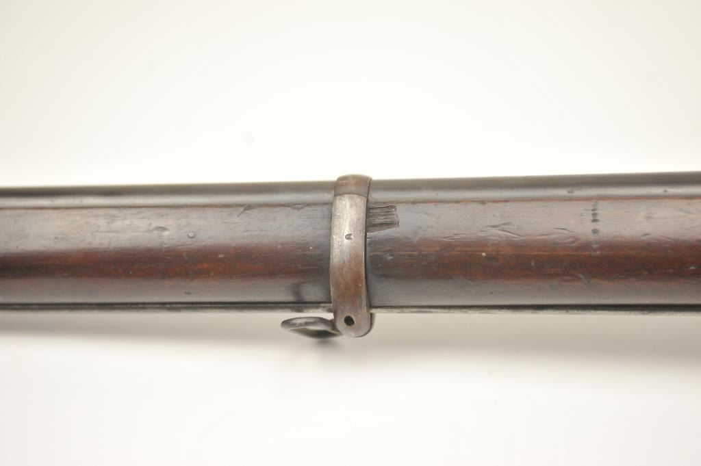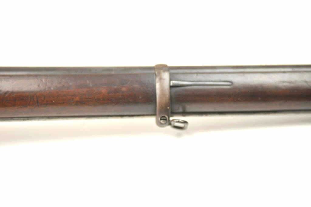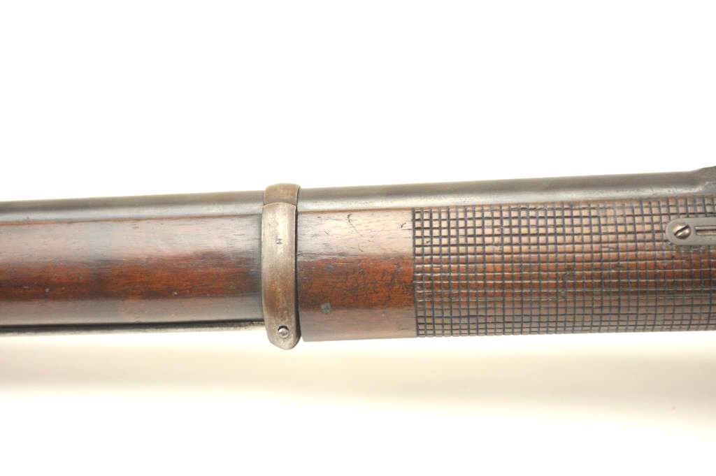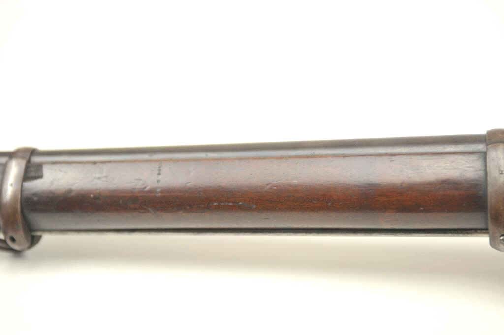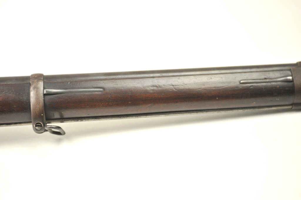 A rare Swiss Model 1869/70 Vetterli Rifle by V. Erlachu & Cie in Thun, S/N 21809 in .41 rimfire caliber. This is a rare rifle not to be confused with the common 1878 Vetterli. This model is very uncommon and has thesliding loading gate cover and side clip. Checkered fore end and plaid walnut butt. The overall condition is very good with good barrel and wood finish and matching numbers. Excellent bore. The 1869/70 is almost as rare as a Vetterli carbine. First one of these rare military rifle we have offered. Est.: $700-$1400