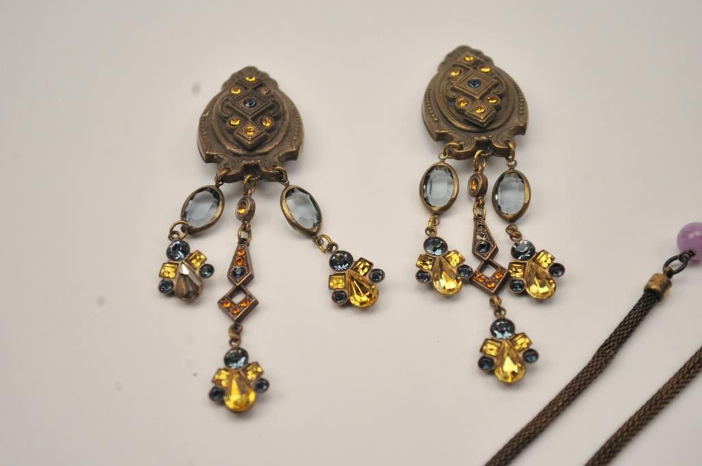 A set of Victorian chandelier earrings in great shape with a a woven magnifying glass necklace with lavender jade beads Est:$85-175