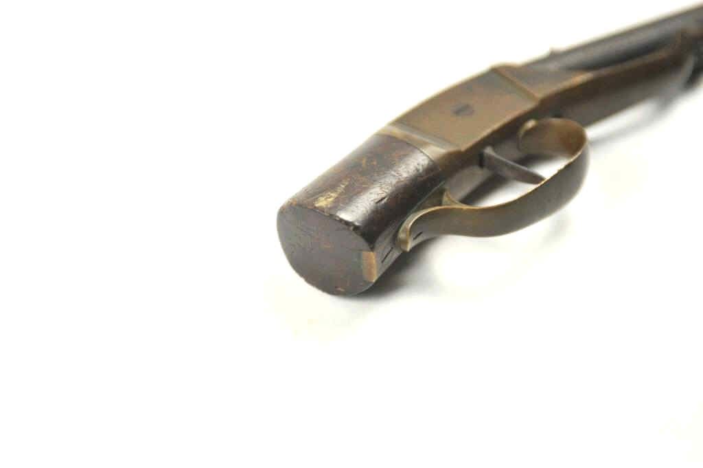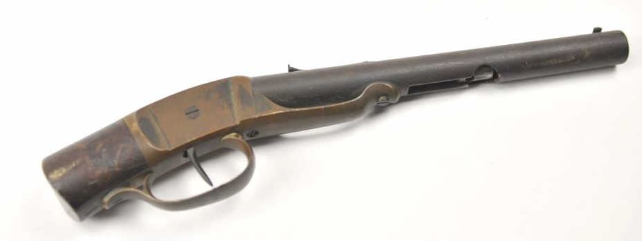 A unique 19th century American parlor pistol signed “J. Widmer Newark, N.J.”. Measures 12” overall with a 8” round steel barrel and .22 caliber. Brass frame with very short wood stock. The brass is beautiful untouched deepgolden brown. The barrel is deep even age brown. Jacob Widmer was a gun maker in Newark who made Schuetzen rifles and parlor guns from 1866-1878. This model is complete with mechanism and front and rear sights wasdoubtless a special order or a patent model. A fine item for the collector of unique parlor pistols. Est.: $300-$600