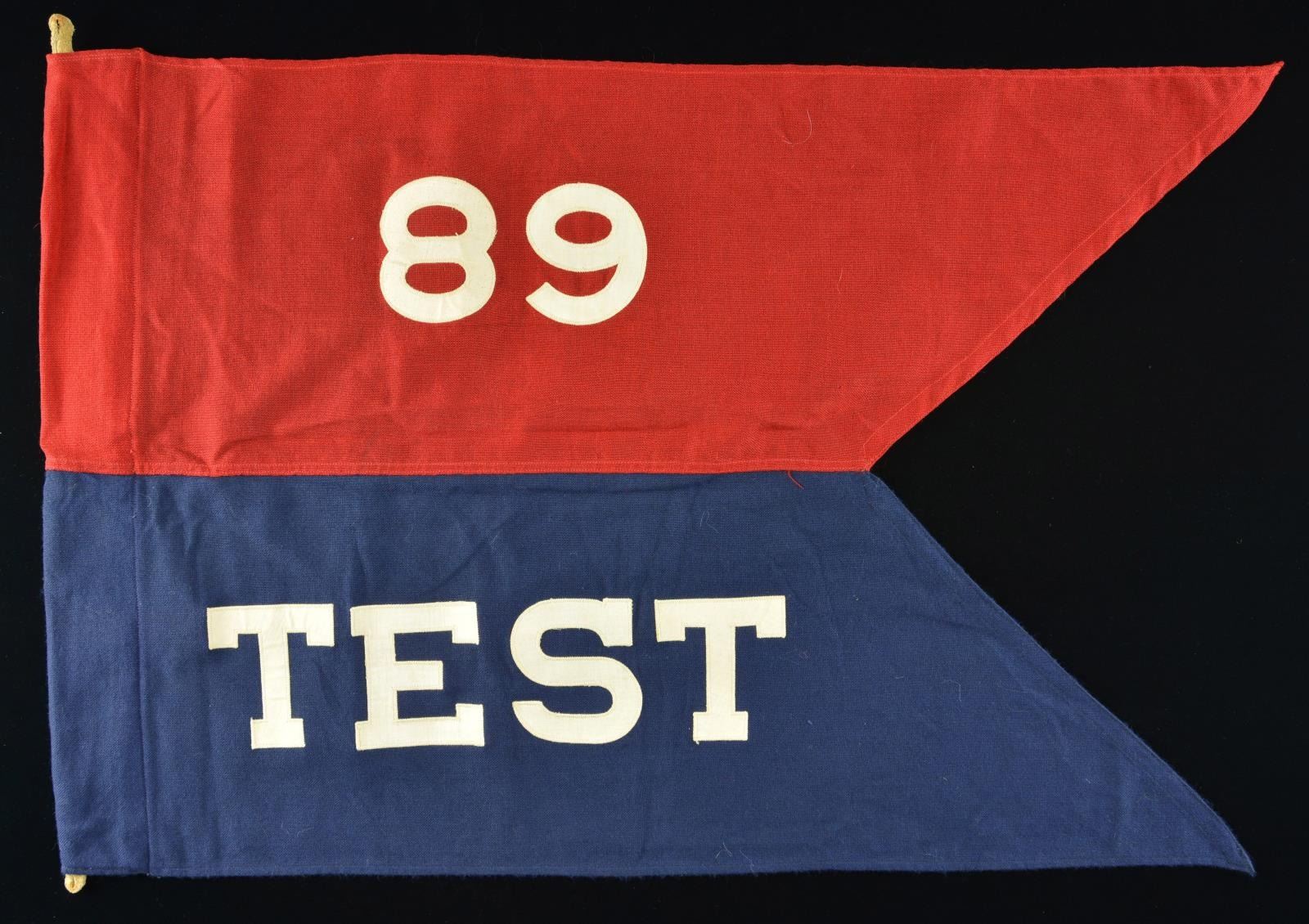 20" x 26" red over blue (colors for Adjutant General Corps) bunting guidon, double applique white cotton numbers & letters. Not positive what designation is but WW2 era undated Philadelphia QM depot label inside sleeve hoist. CONDITION: fine. (02-19473-45/JS). $200-300.