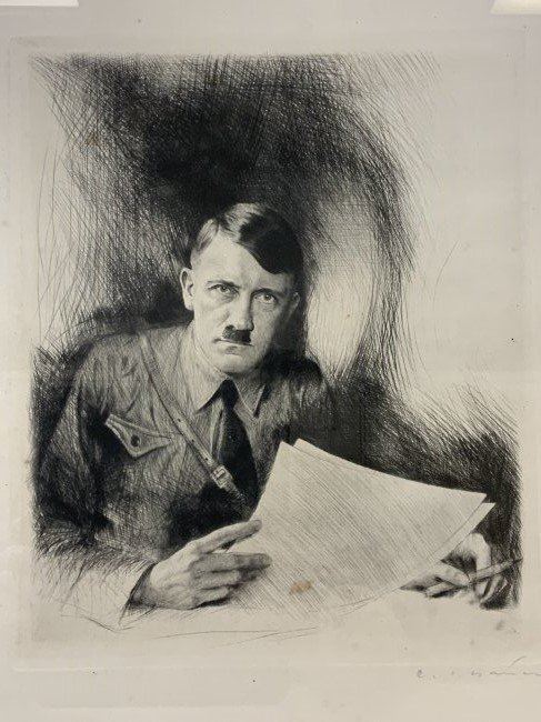 ADOLF HITLER PORTRAIT PERIOD PRINT. FRAMED IN OLD FRAME WITH SILVER BORDER. APPEARED TO BE SIGNED BY THE ARTIST IN PENCIL. 15 1/2 X 19 1/4 SIZE