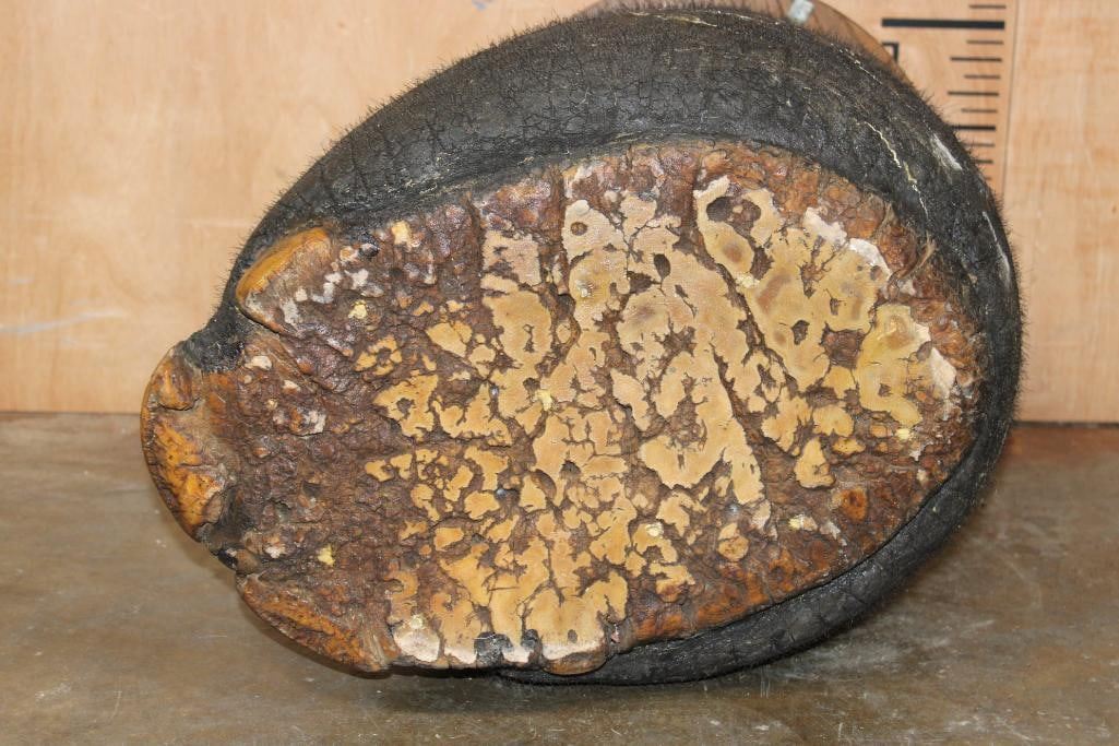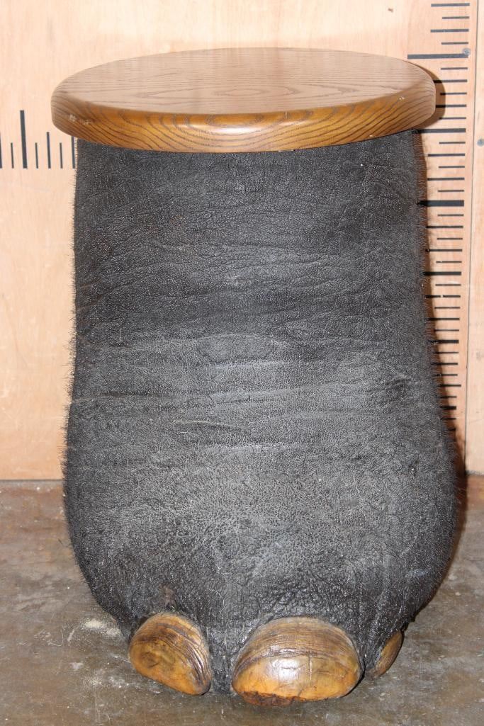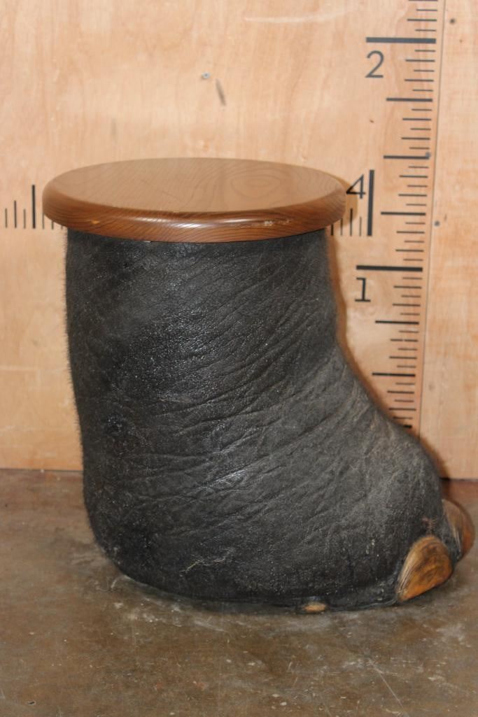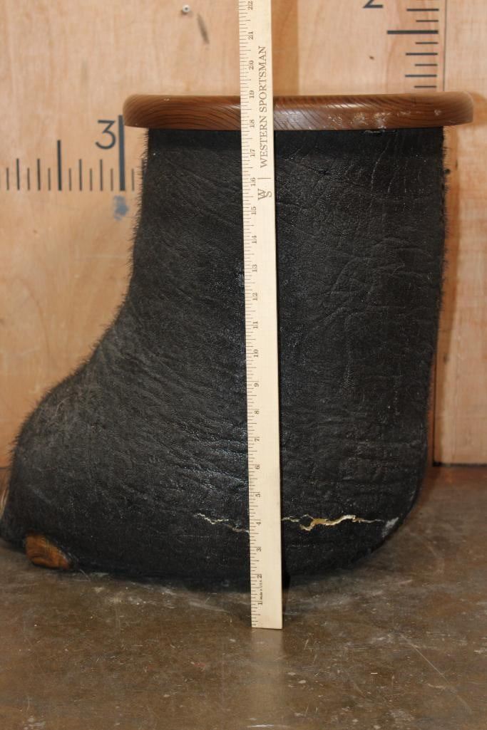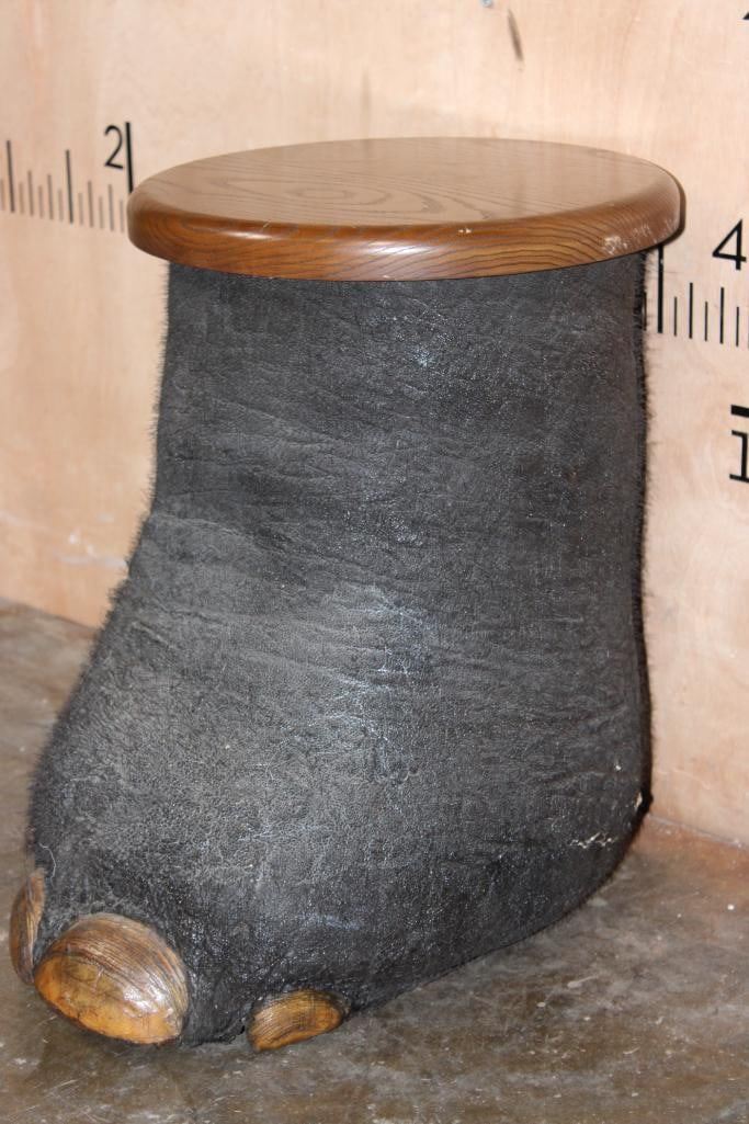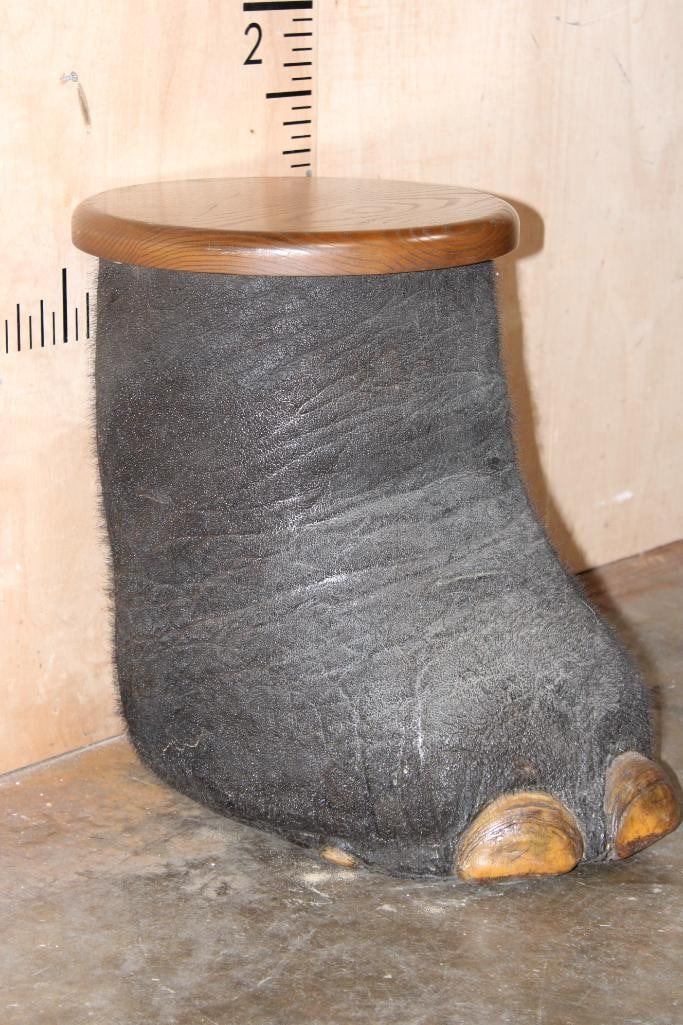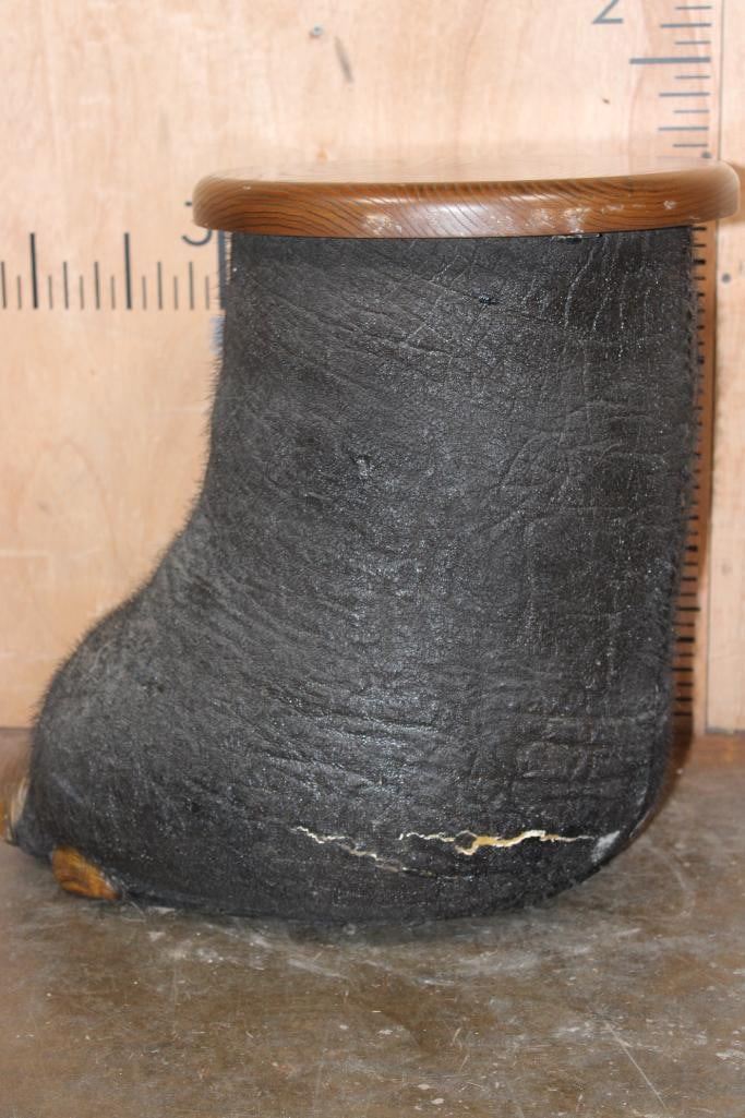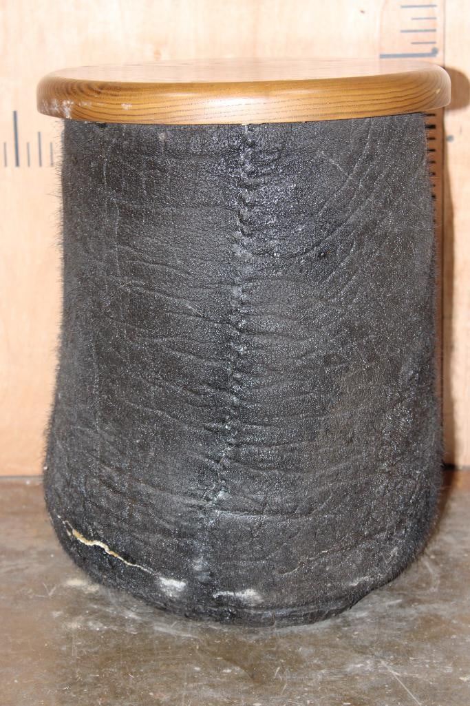 AFRICAN ELEPHANT Foot Stool or End Table with a Wood Top. It measures 20" Long x 19" Tall x 16" Wide. The Wood Table Top measures 14" in Diameter and it Weighs 18 lbs. TAXIDERMY FURNITURE